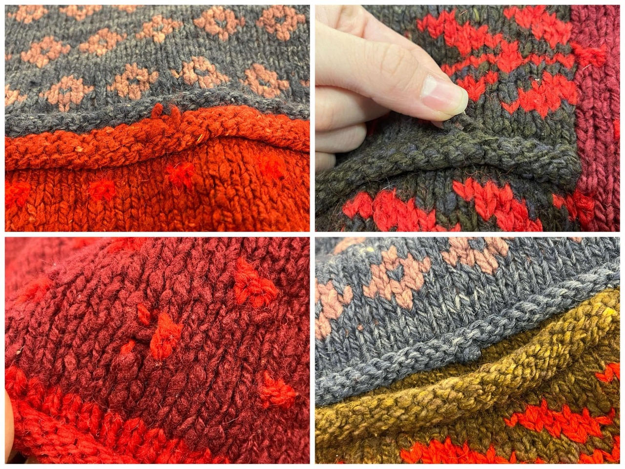 後ろ側の一部が違う色の糸で編まれており、汚れのように見えますが、ダメージではございません。