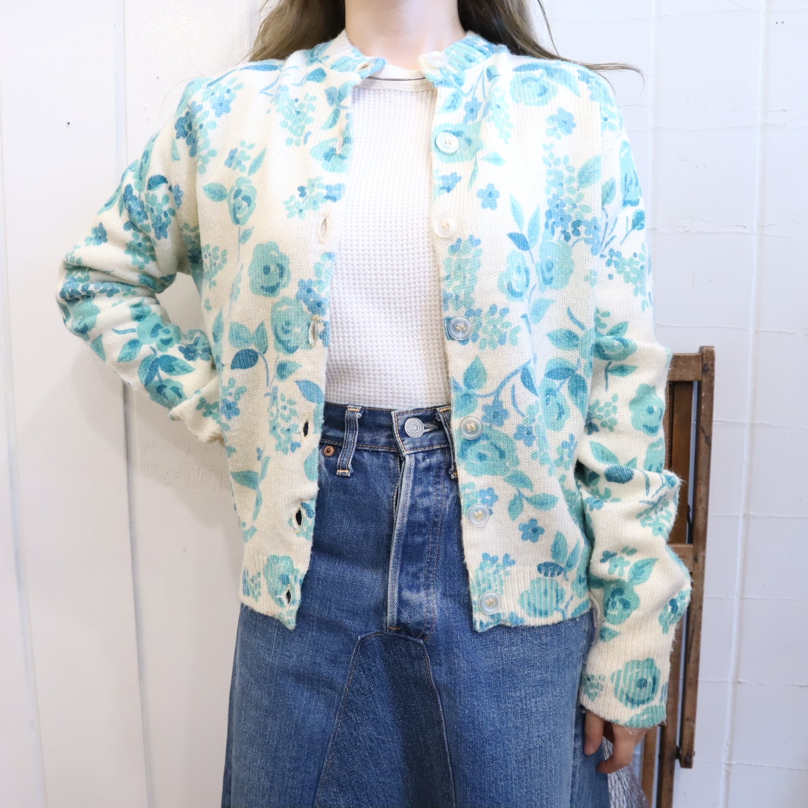 60s white×turquoise blue flower silkscreen knit cardigan [l-2039]