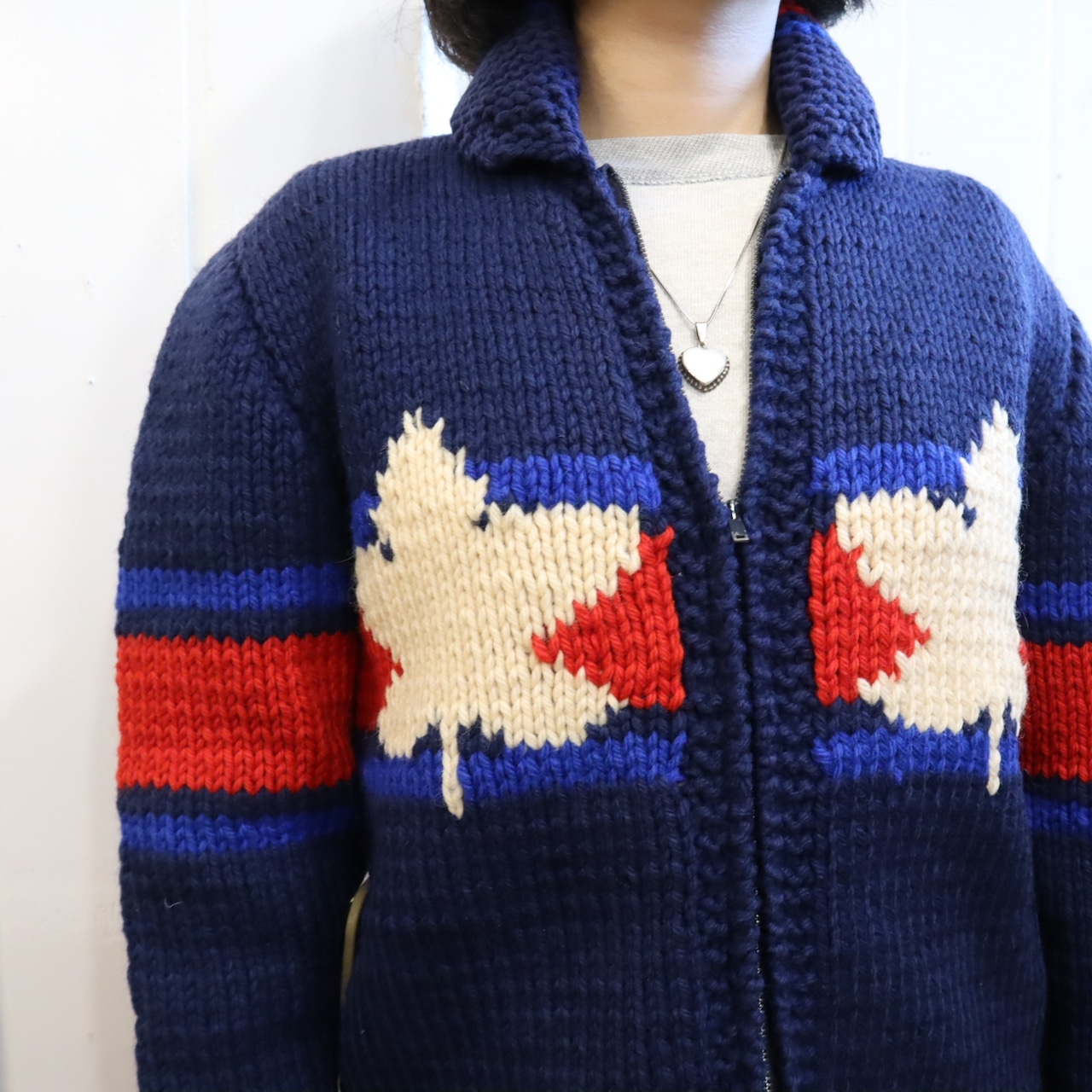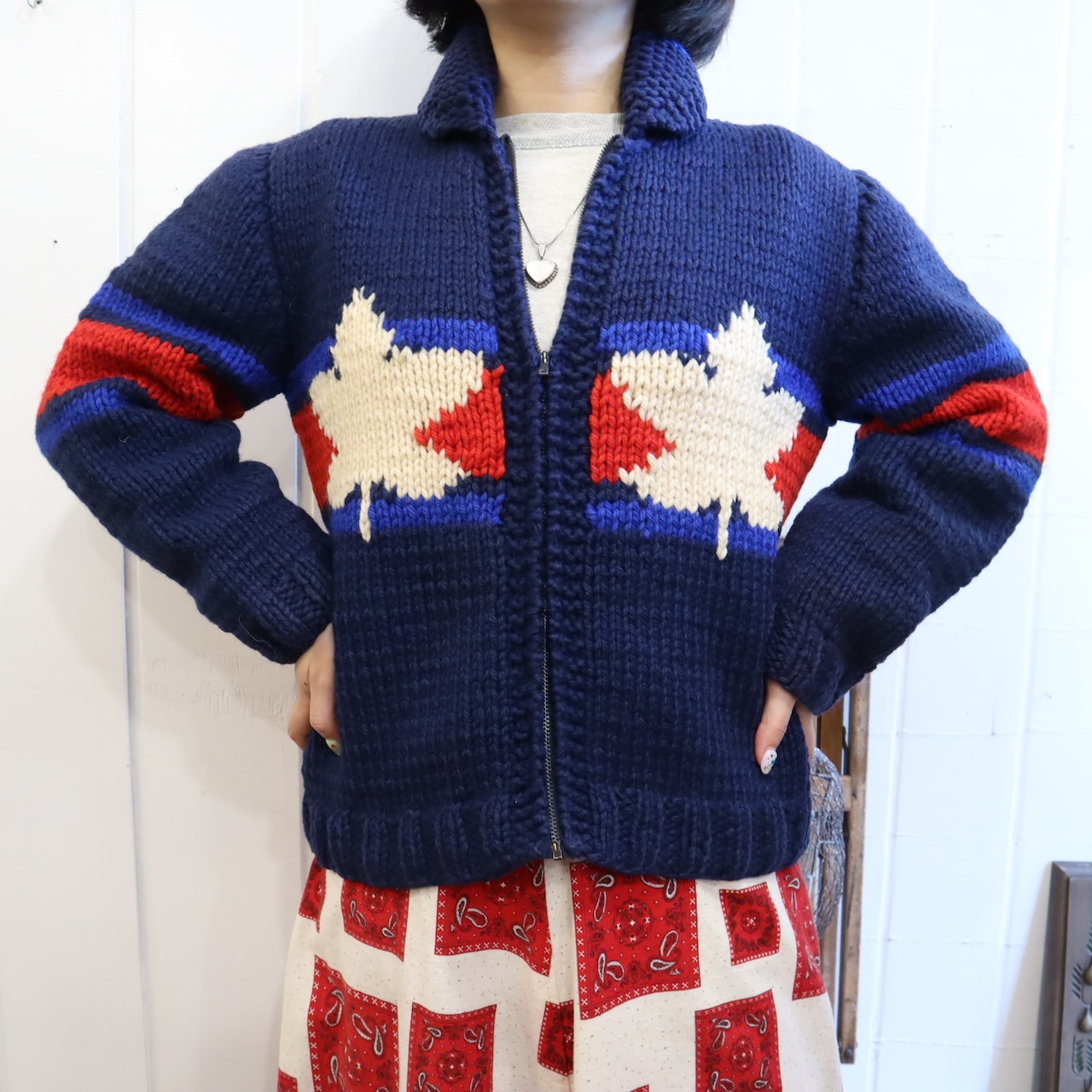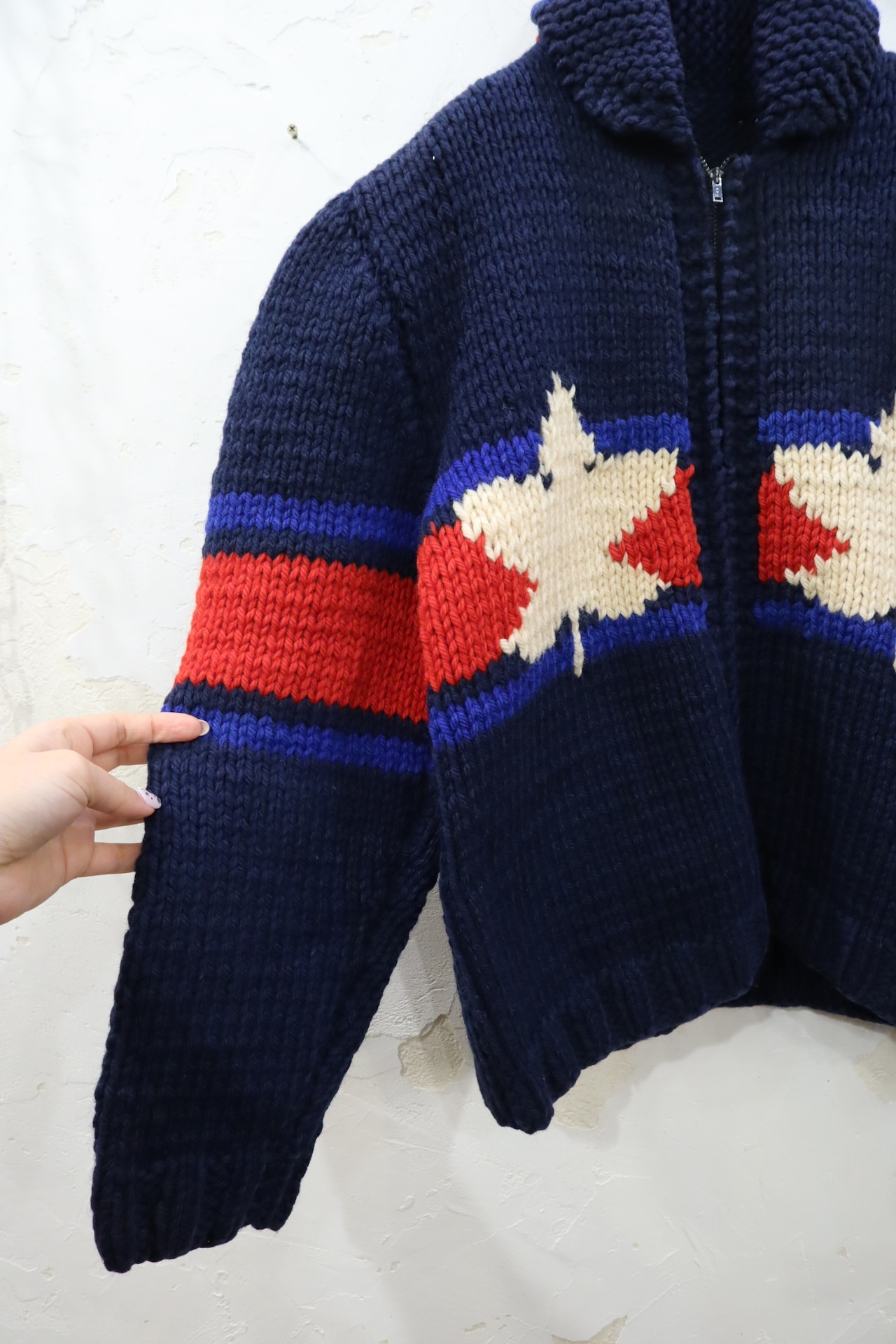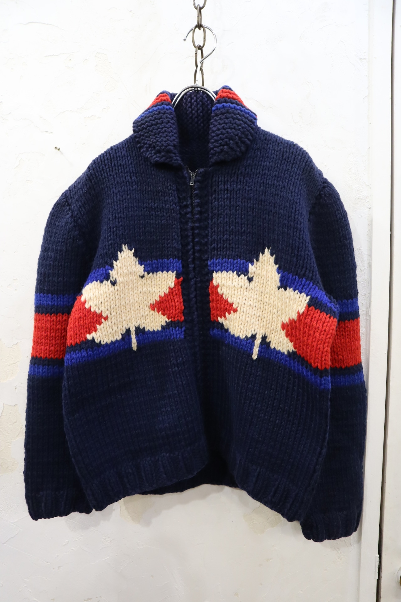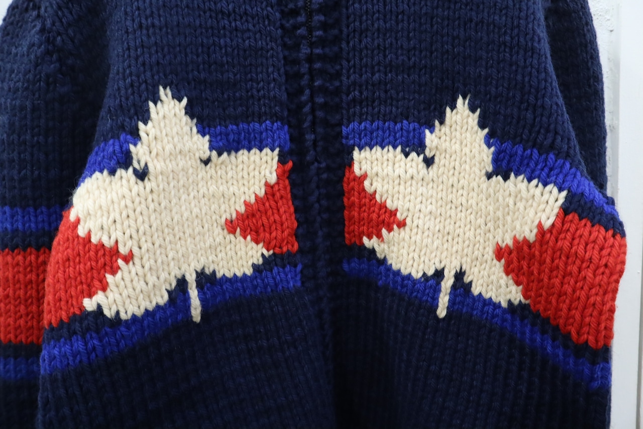 navy×red×white icehockey pattern cowichan knit cardigan [l-2044]