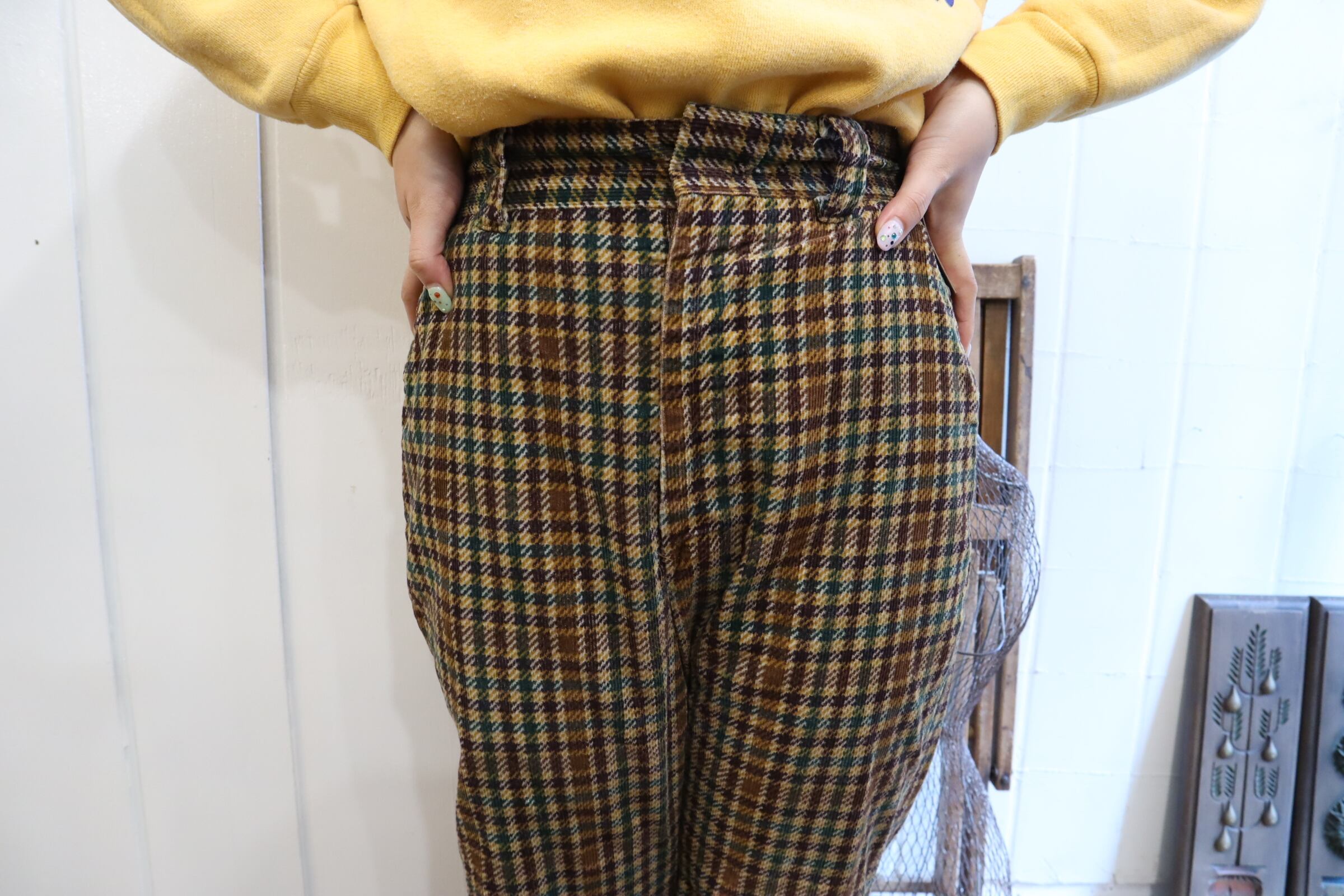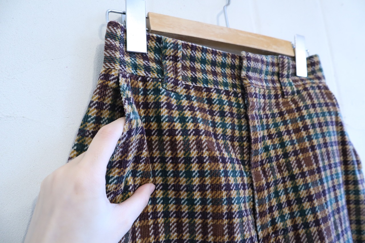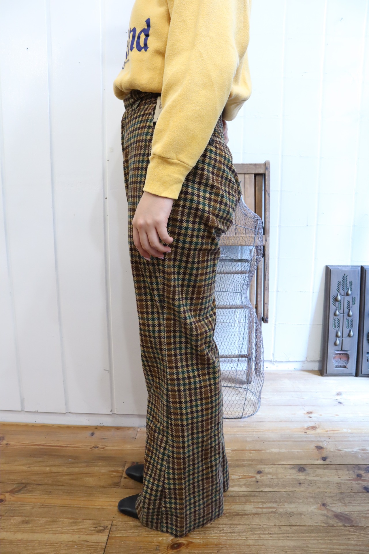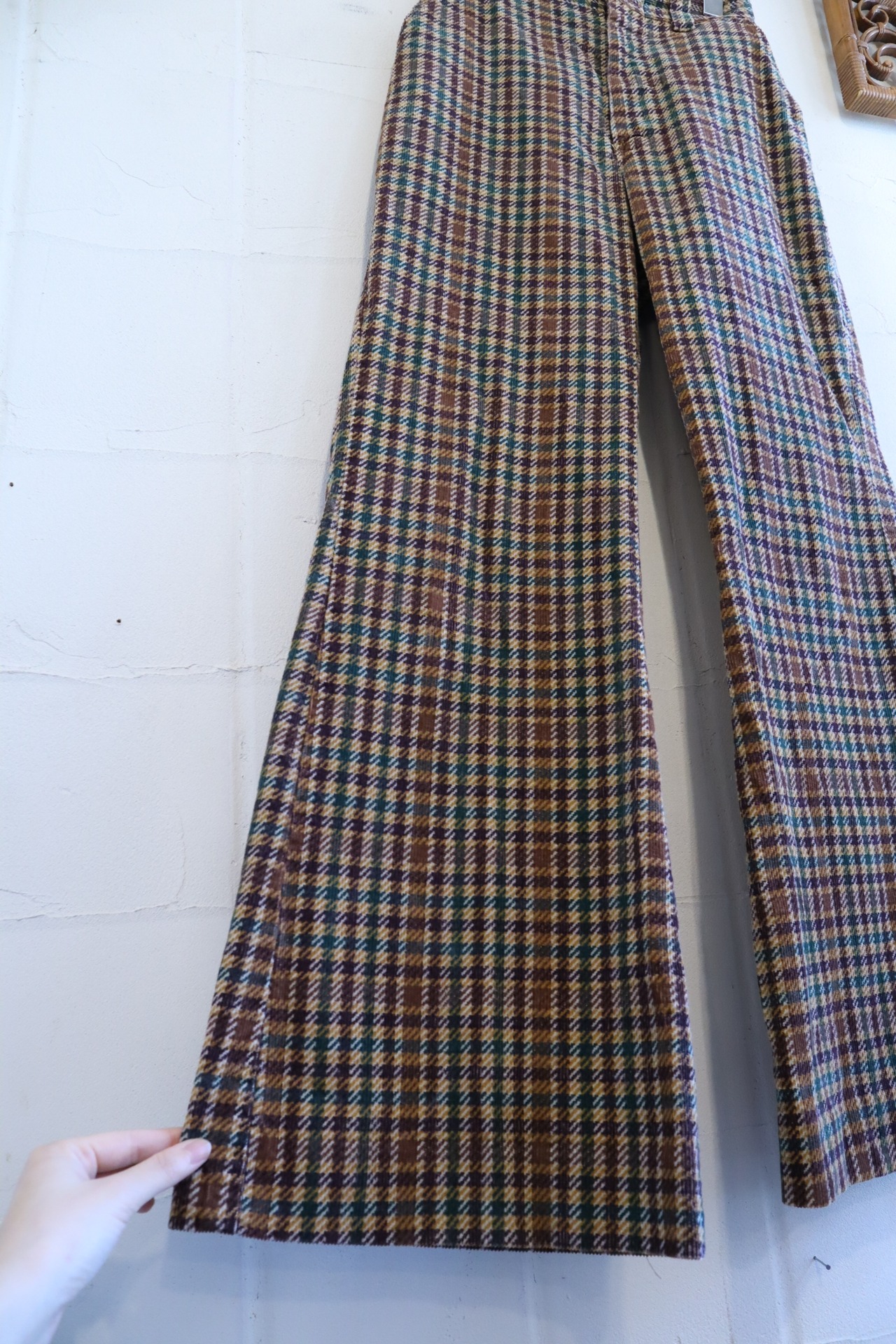 -70s brown×green plaid corduroy flare pants [l-2047]