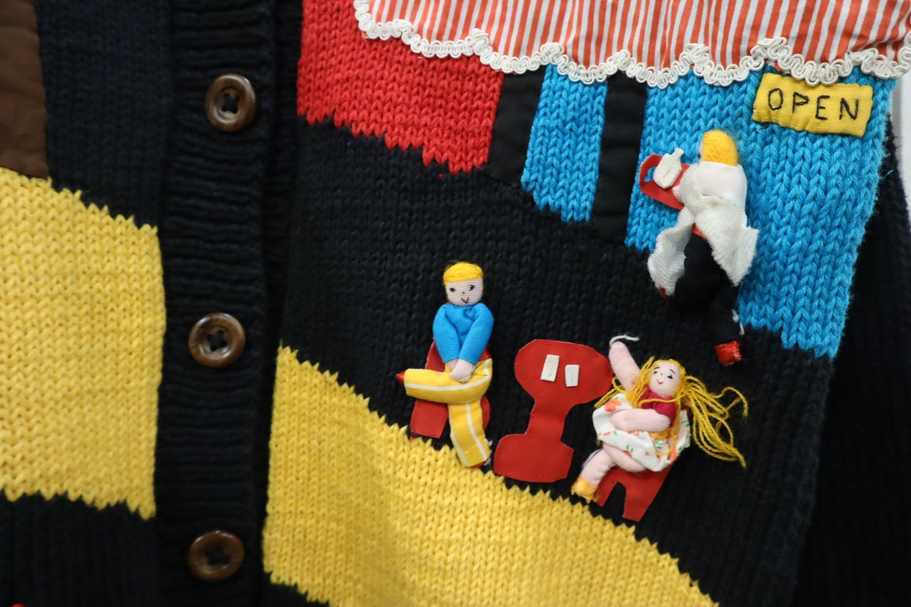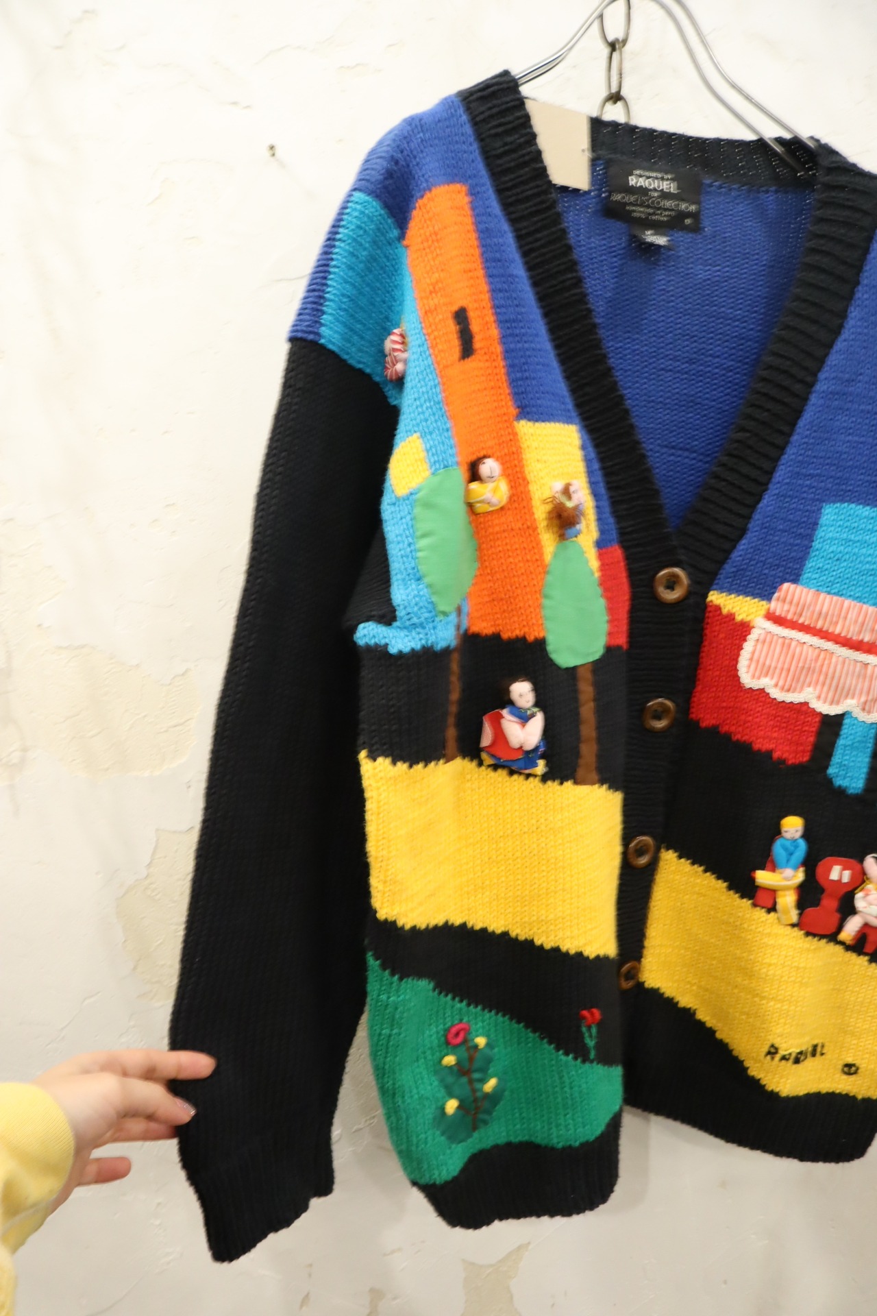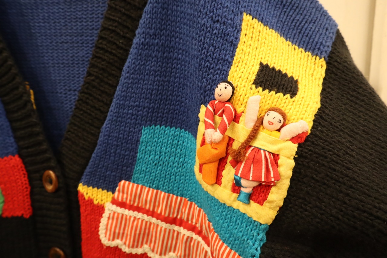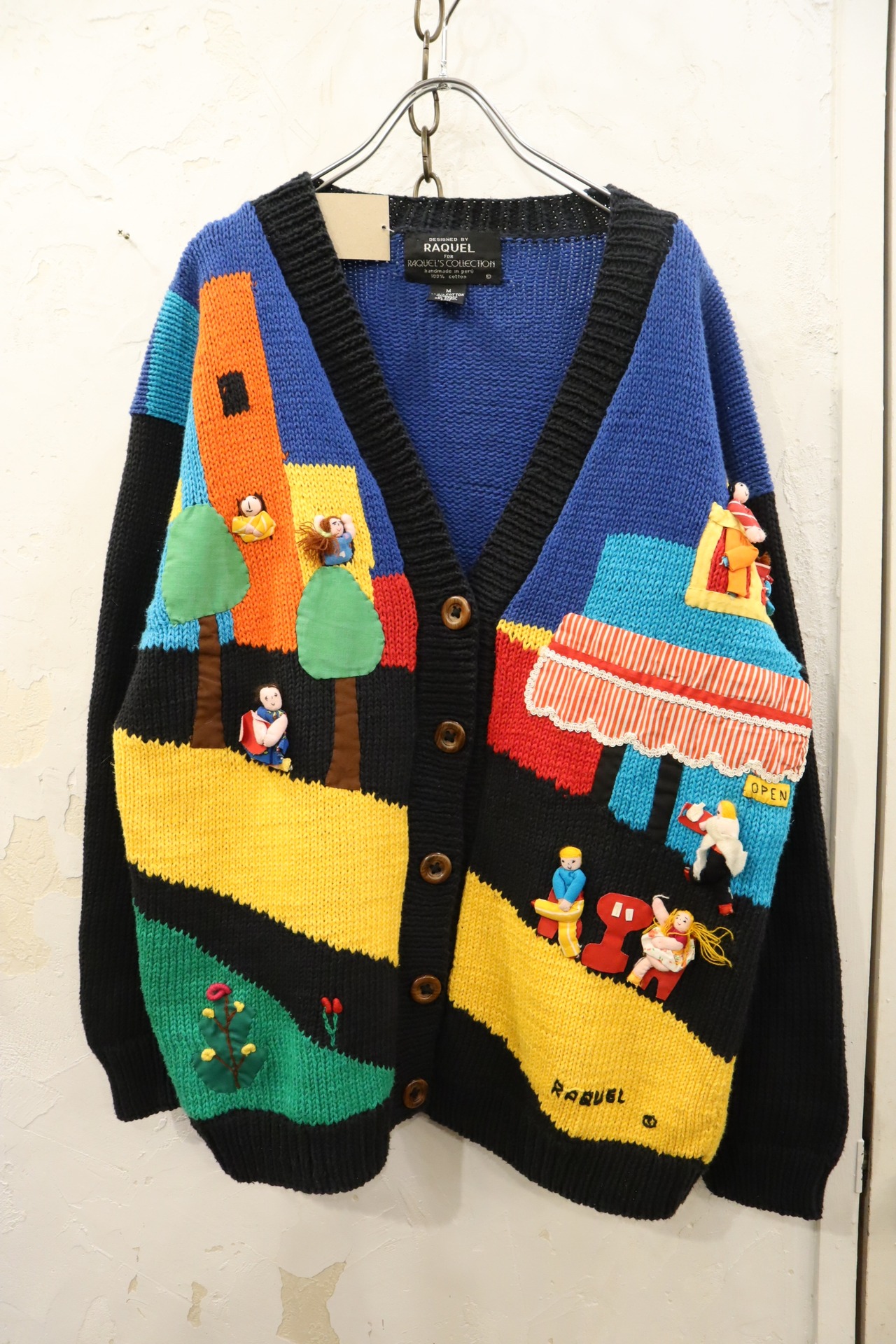 カラフルなデザインと人形がつけられていてとてもユニークなカーディガンです!