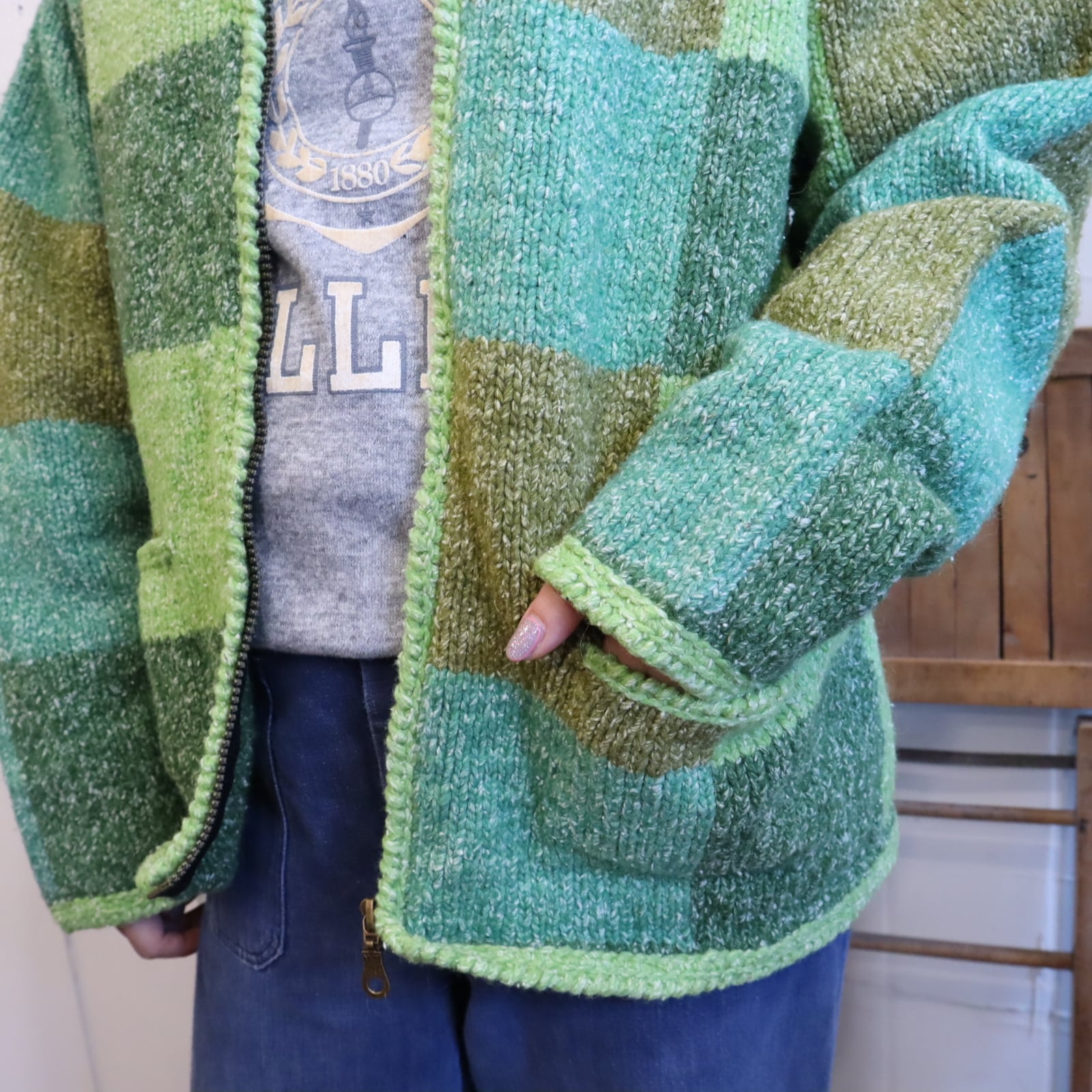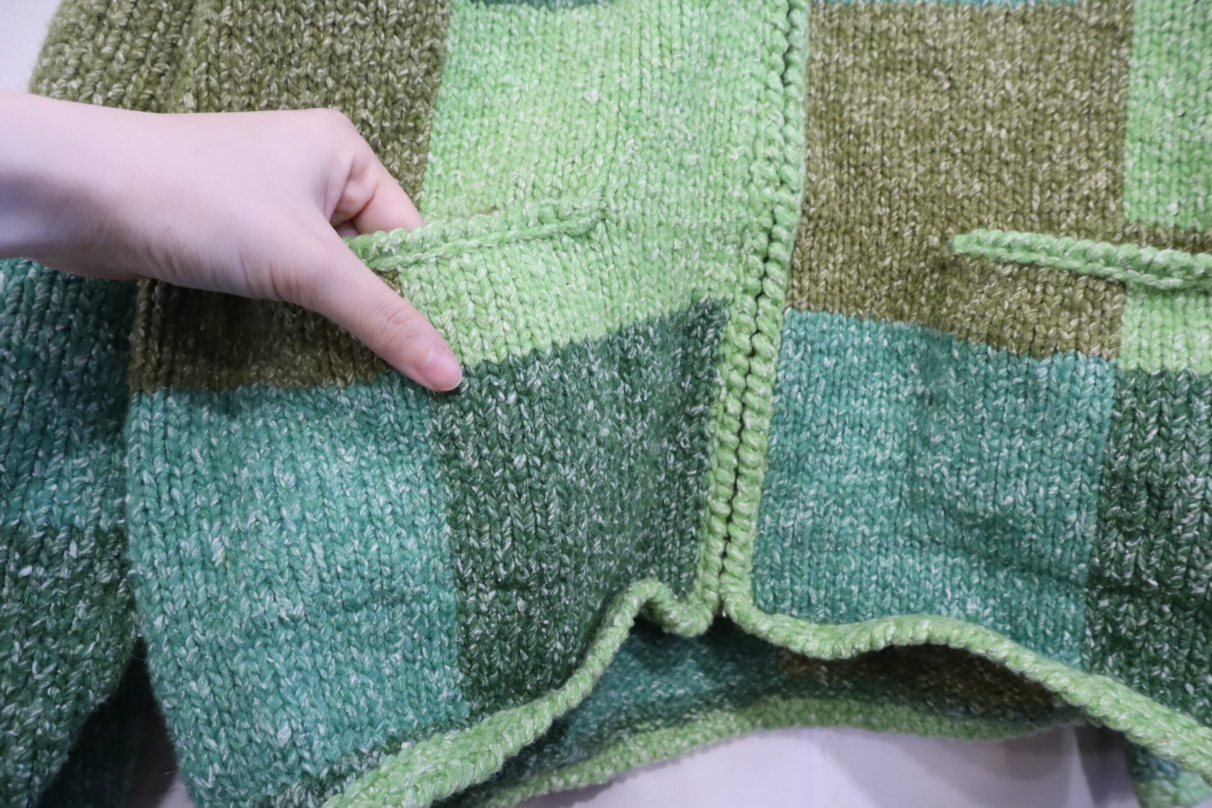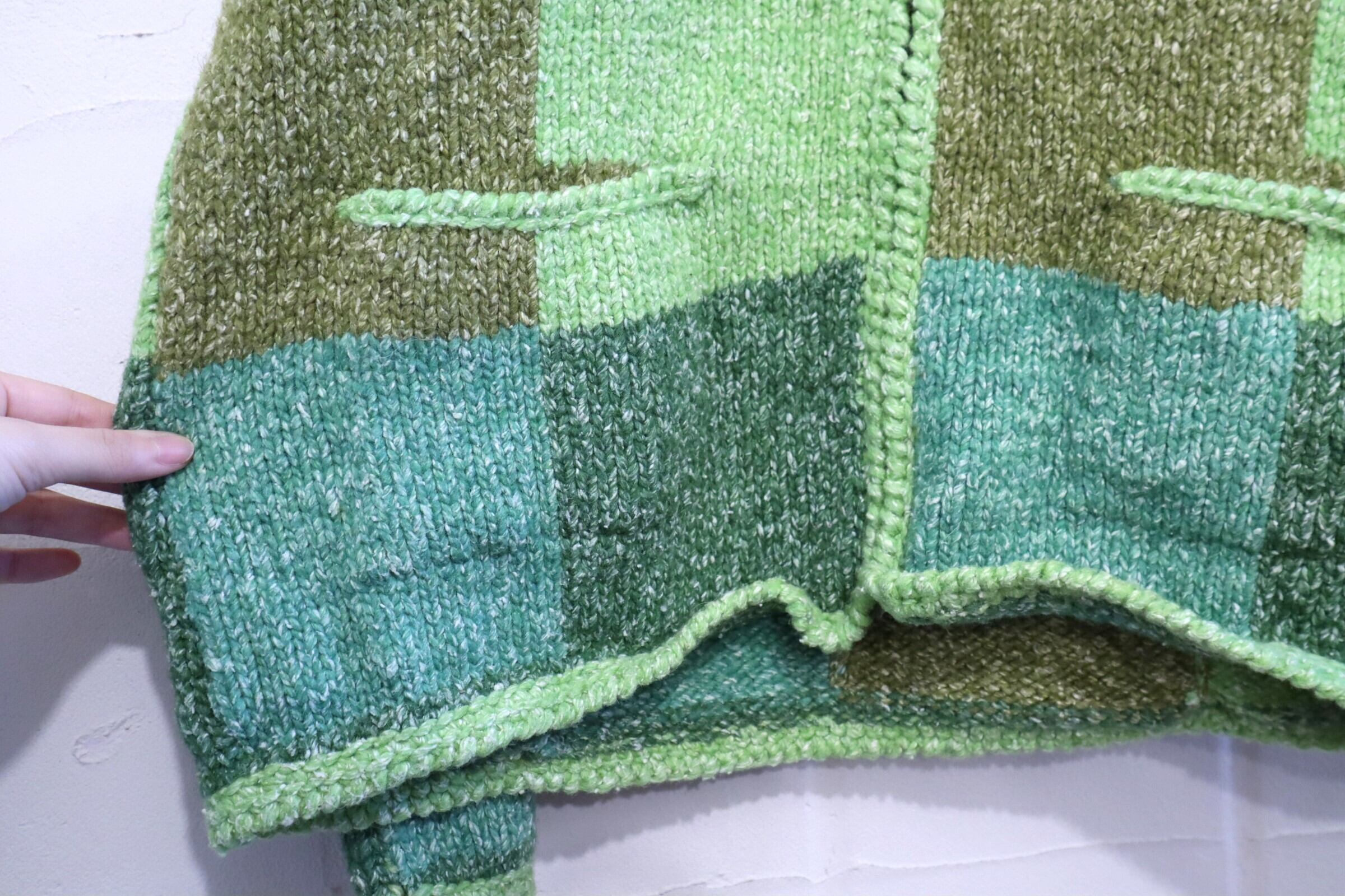 グリーン系のブロックチェックが可愛いエクアドル製ハンドニットカーディガン。