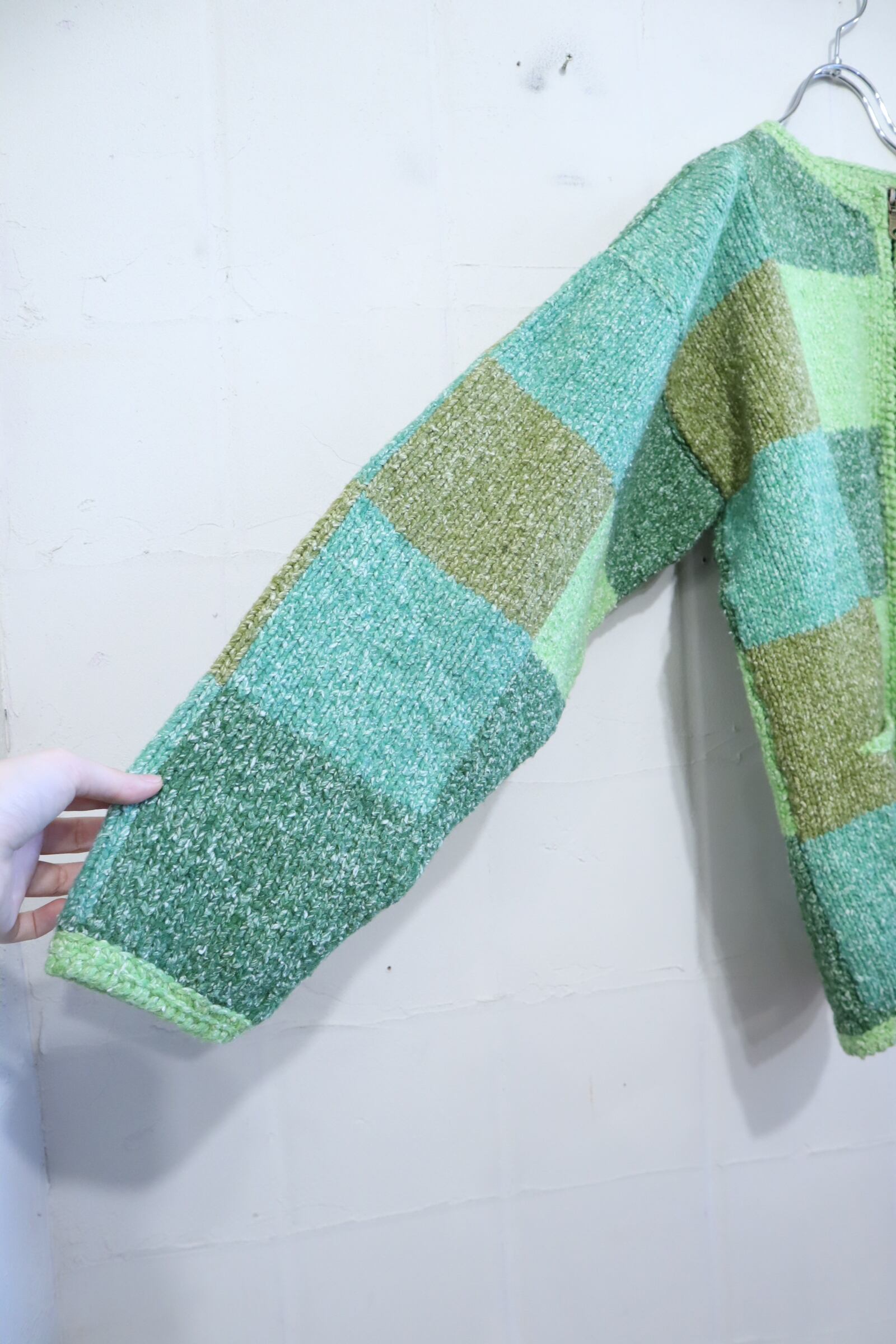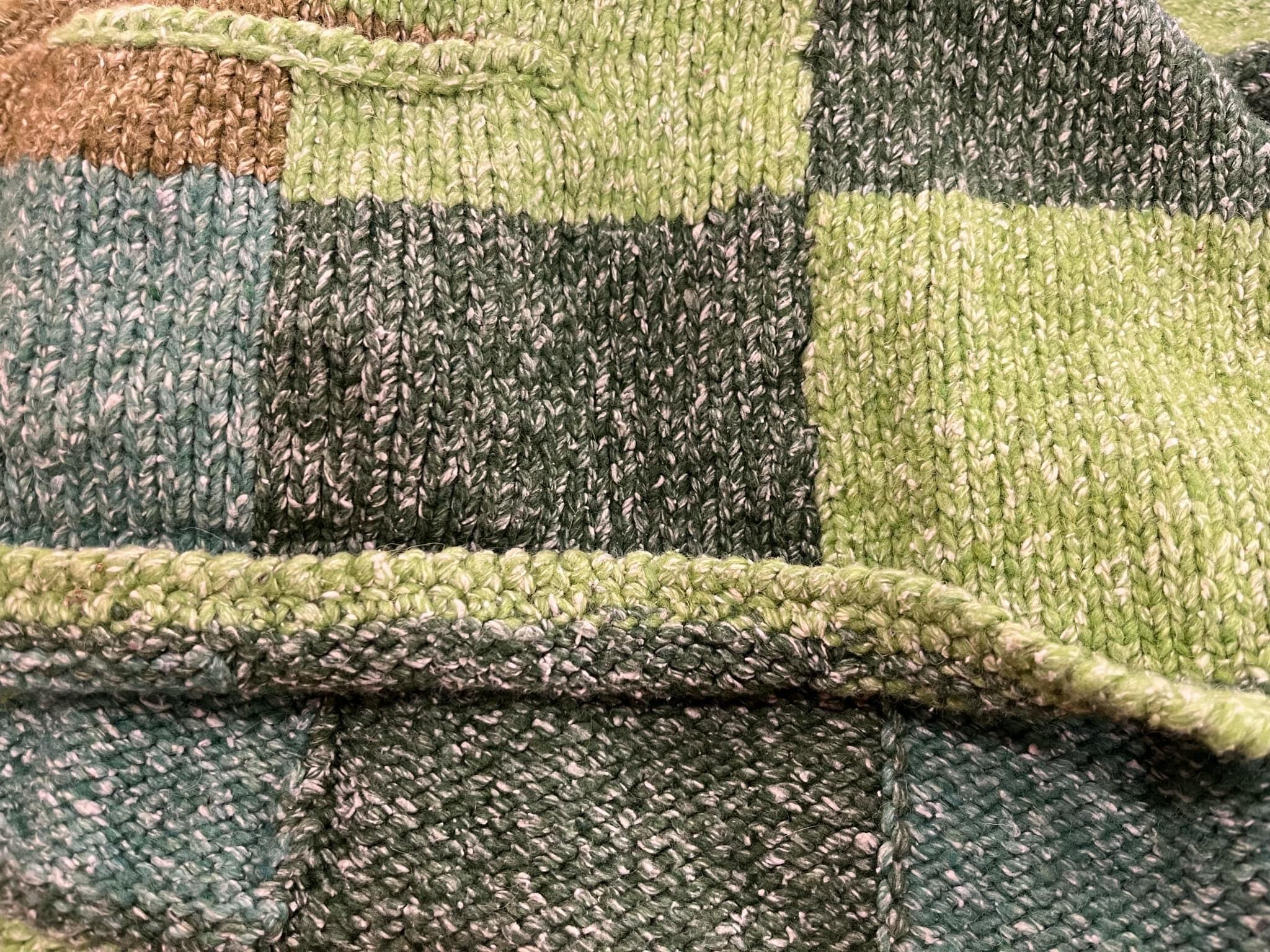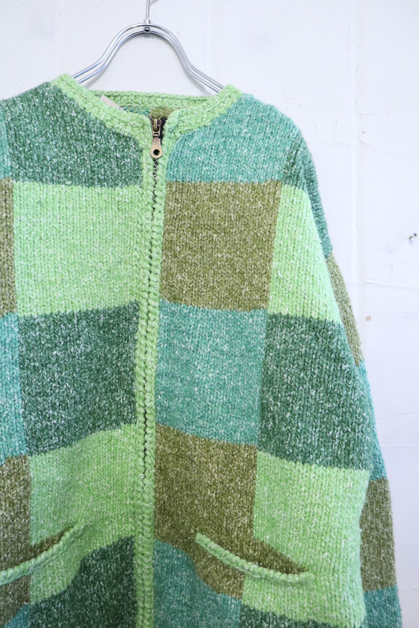 グリーン系のブロックチェックが可愛いエクアドル製ハンドニットカーディガン。
