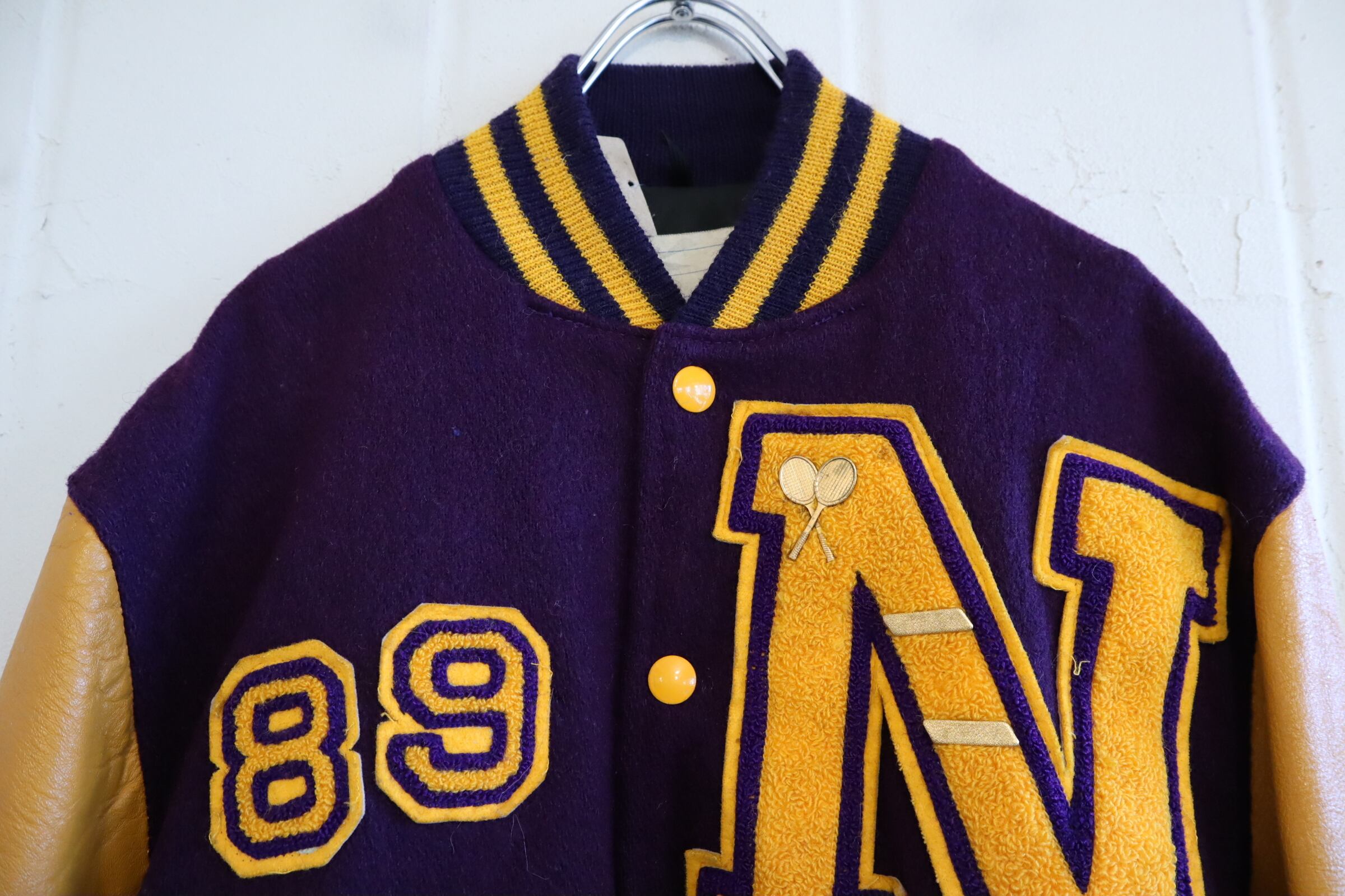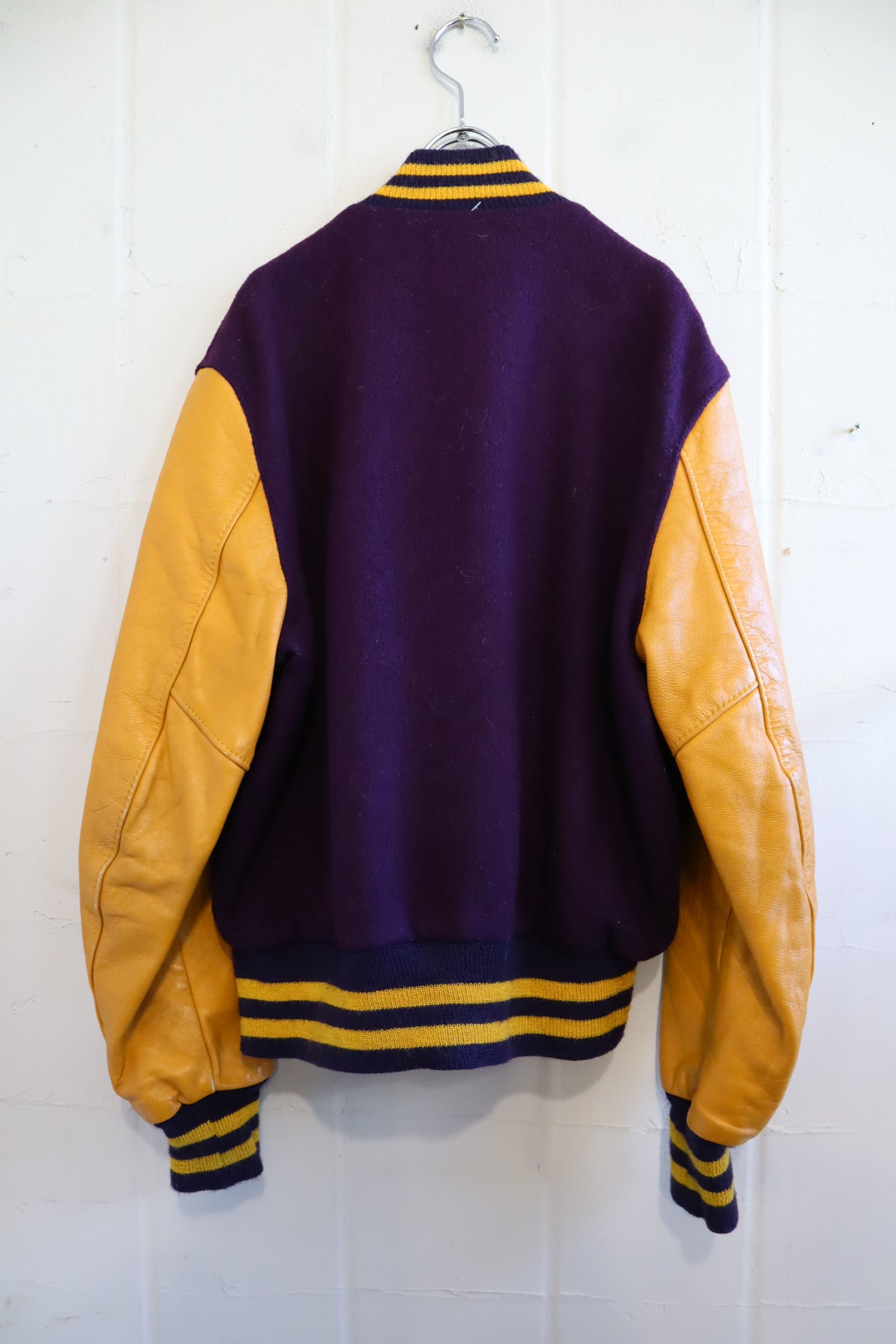 80s made in USA dark purple×mustard leather sleeve stadium jumper [l-2163]