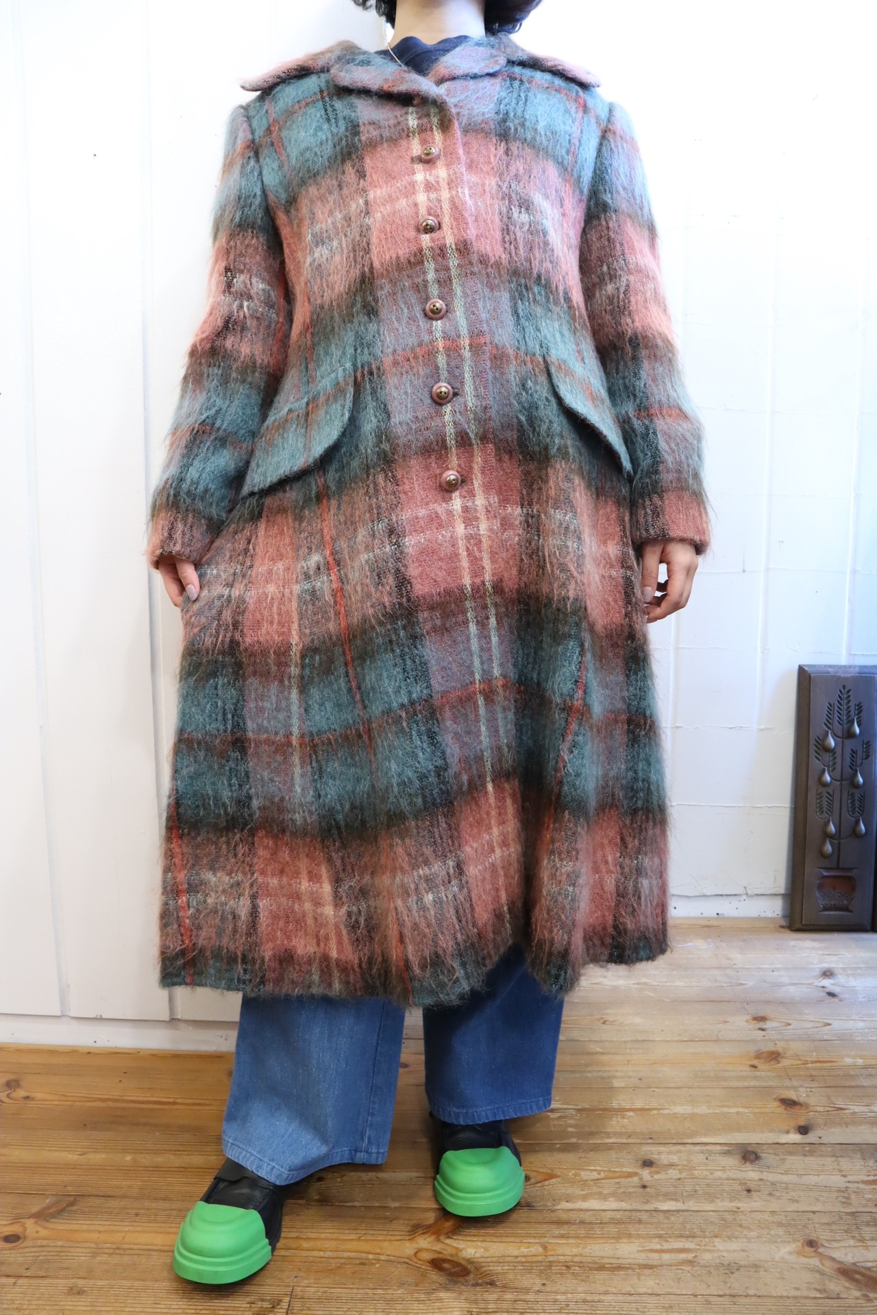 ワンピースのような裾に向かって広がるシルエットが素敵なモヘアコート。