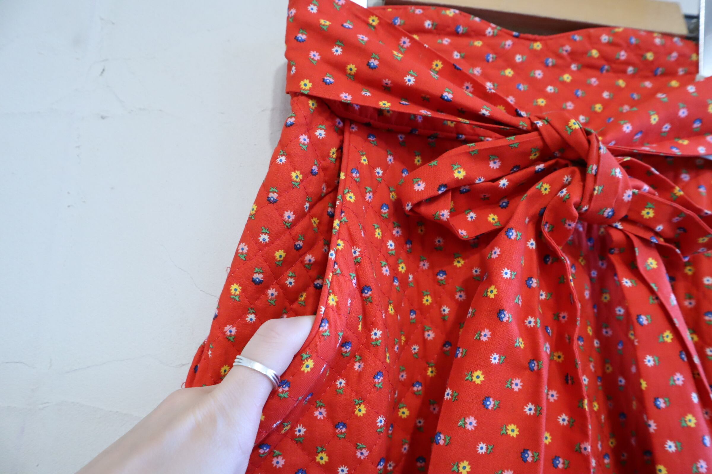 70s red flower print with ribbon quilting long skirt [l-2204]