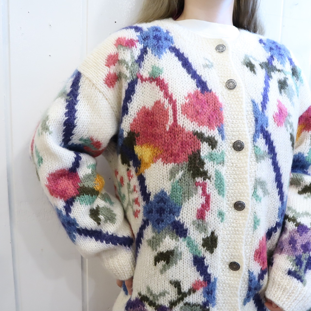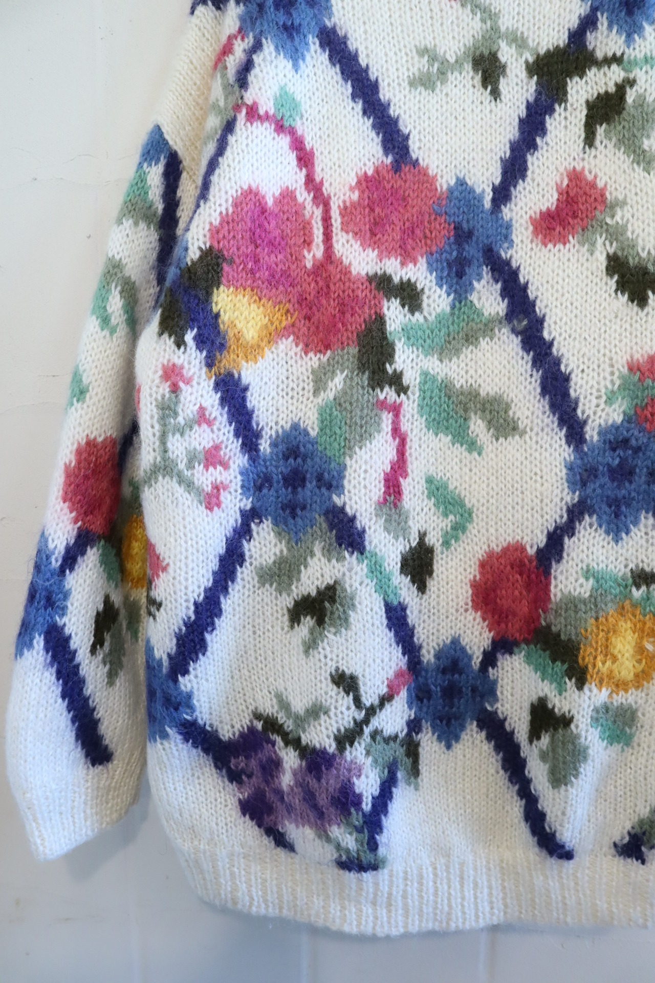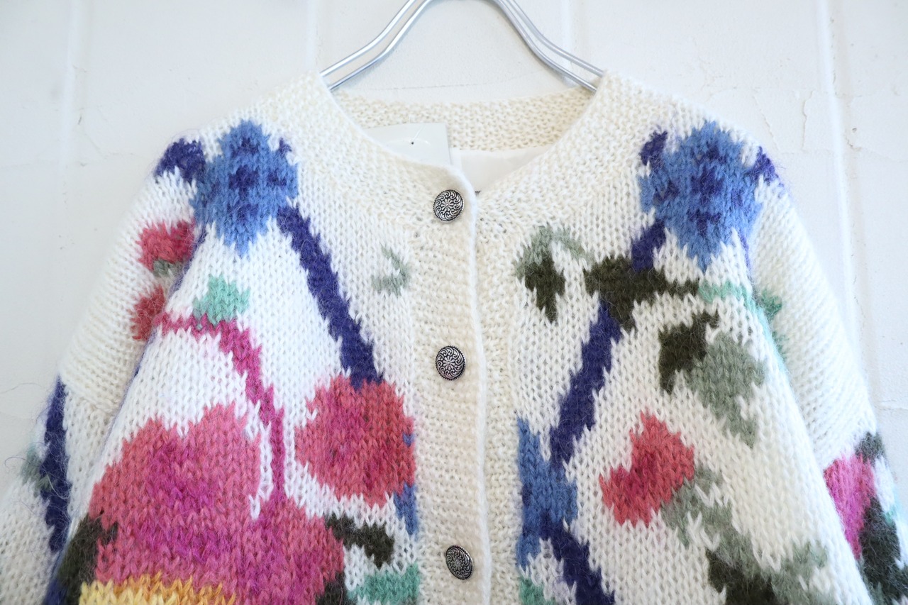white×pink flower pattern mohair knit cardigan [l-2217]