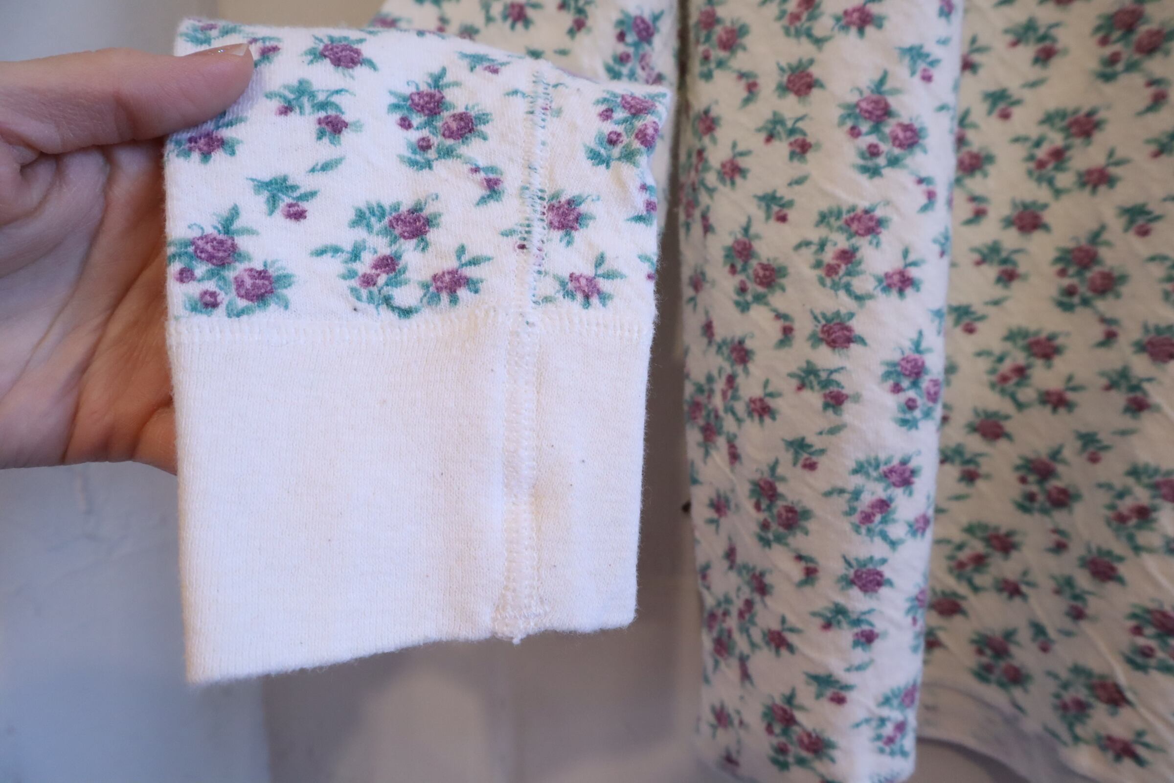 80s duofold offwhite×green flower 2layer thermal tops [l-2247]