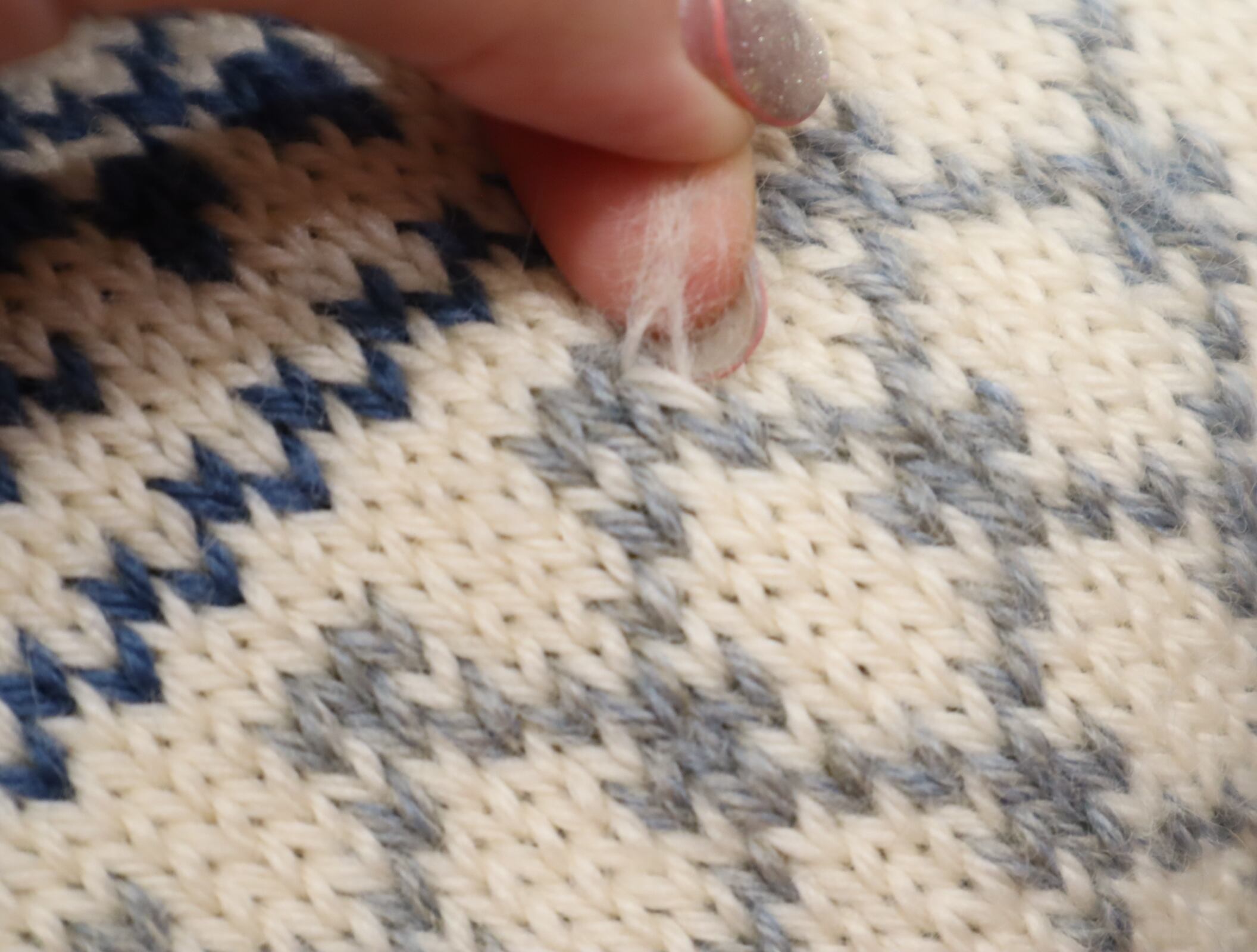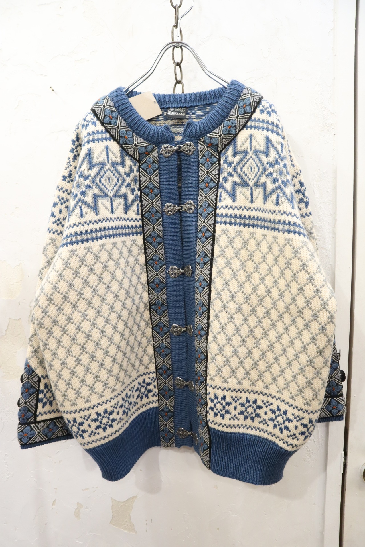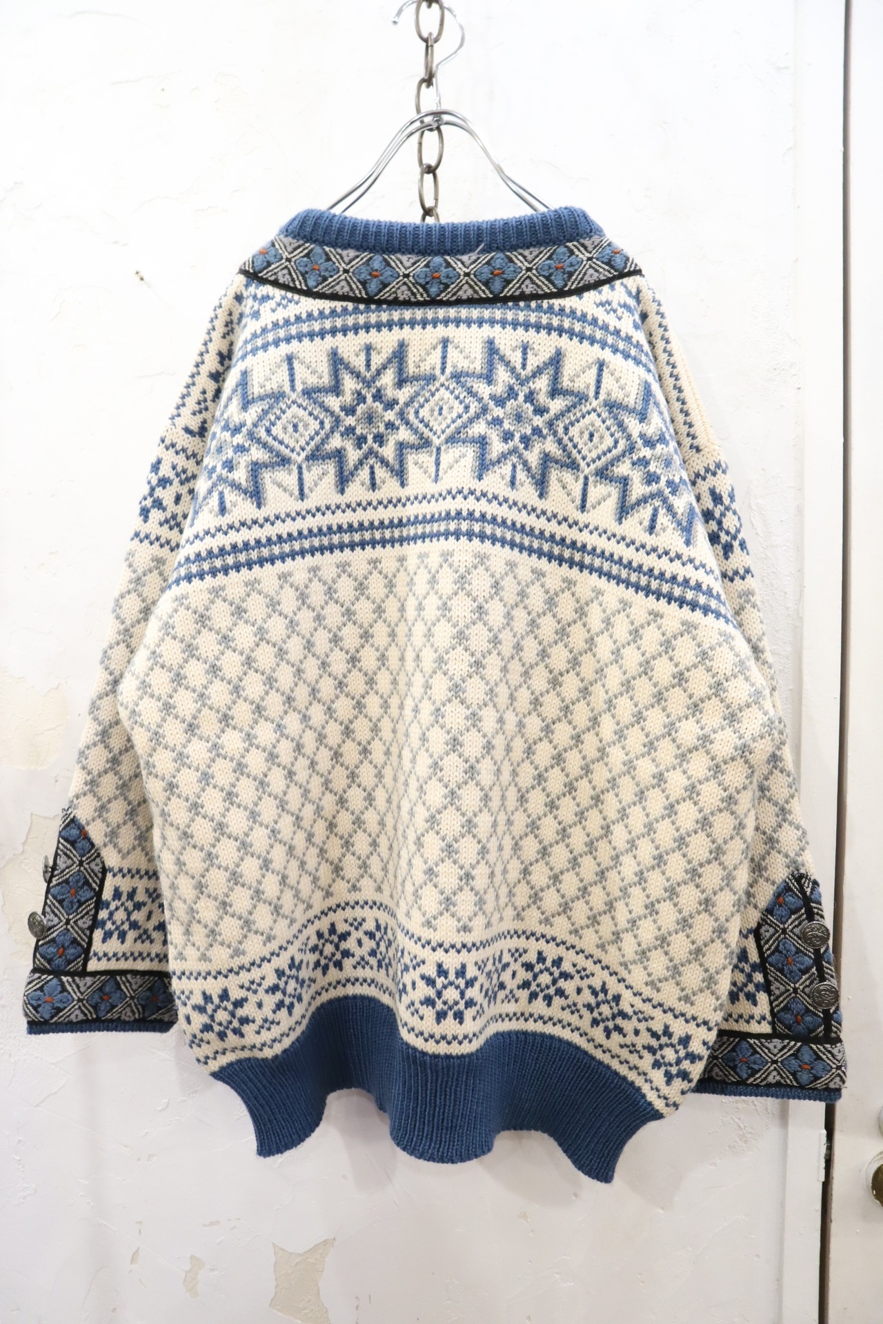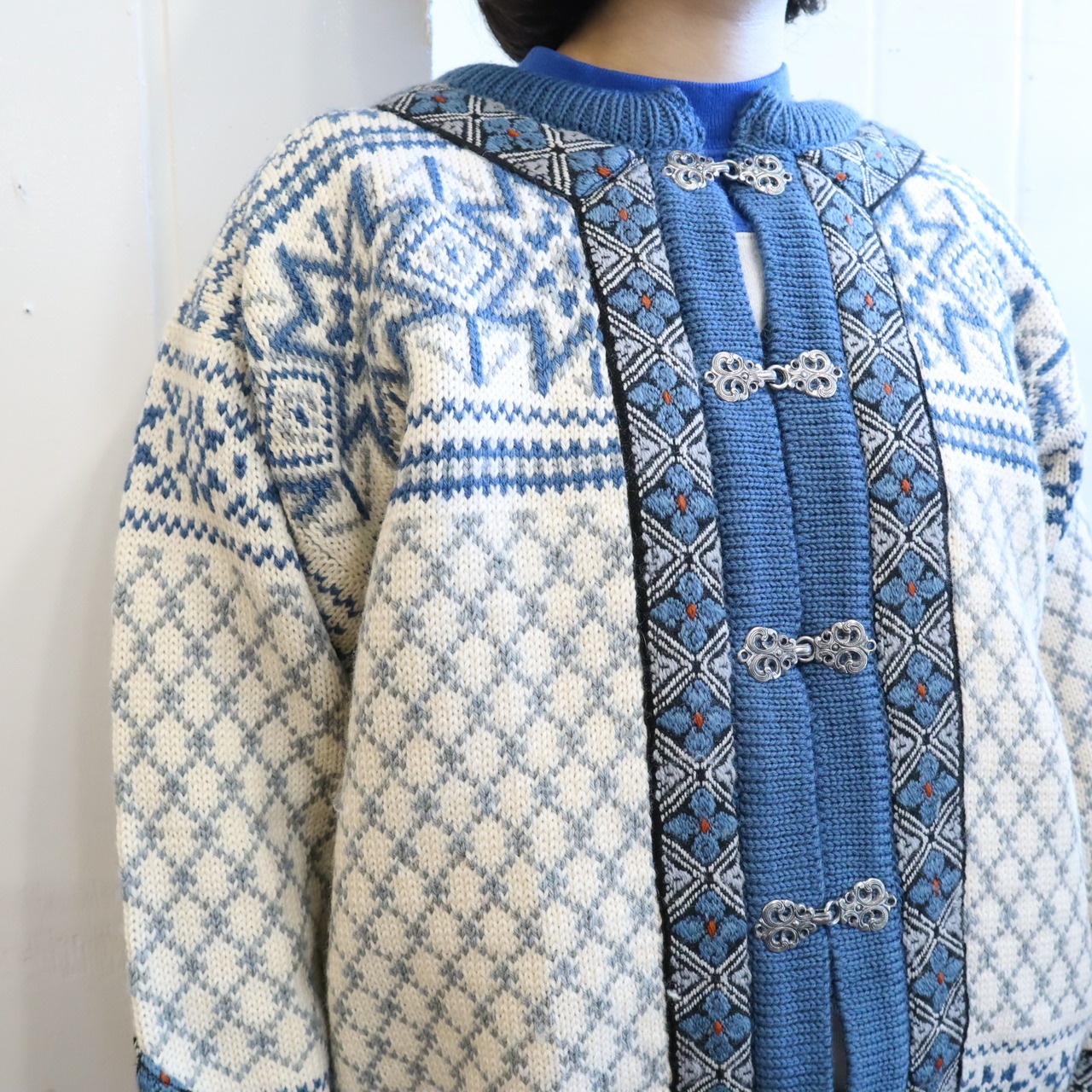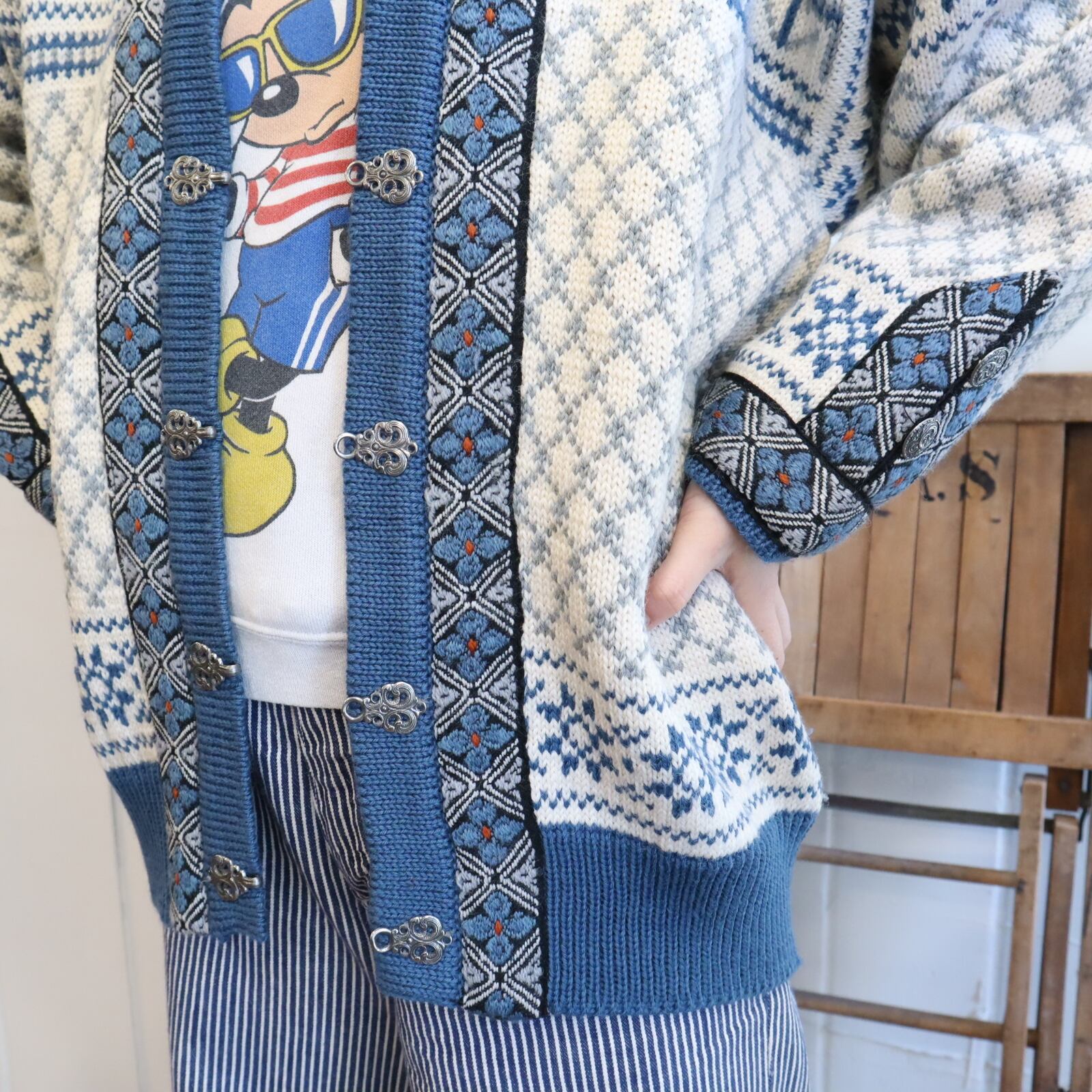 くすみブルーのお色味が素敵なノルディックニットカーディガンです。