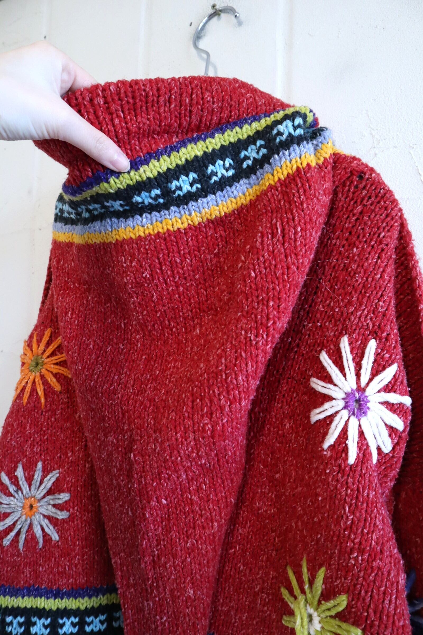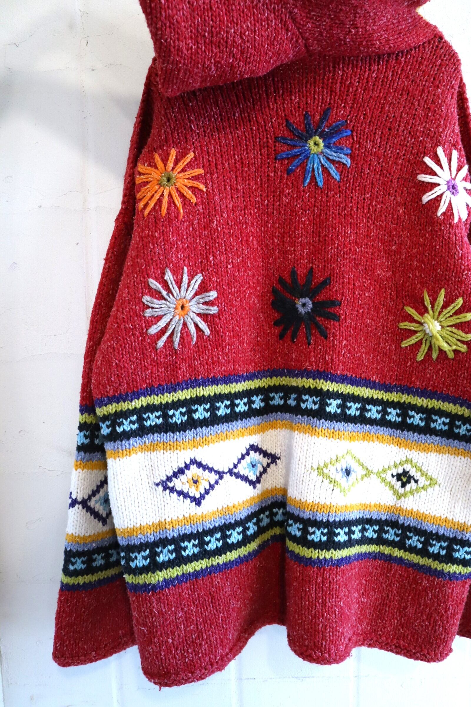 red×colorful flower hood zip Ecuador knit cardigan [l-2291]