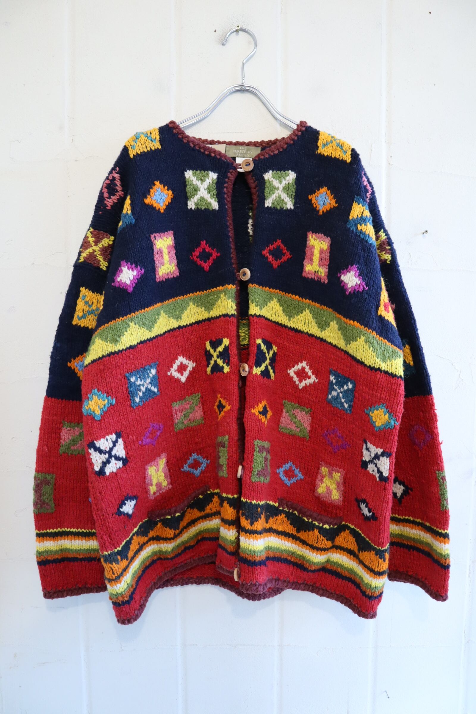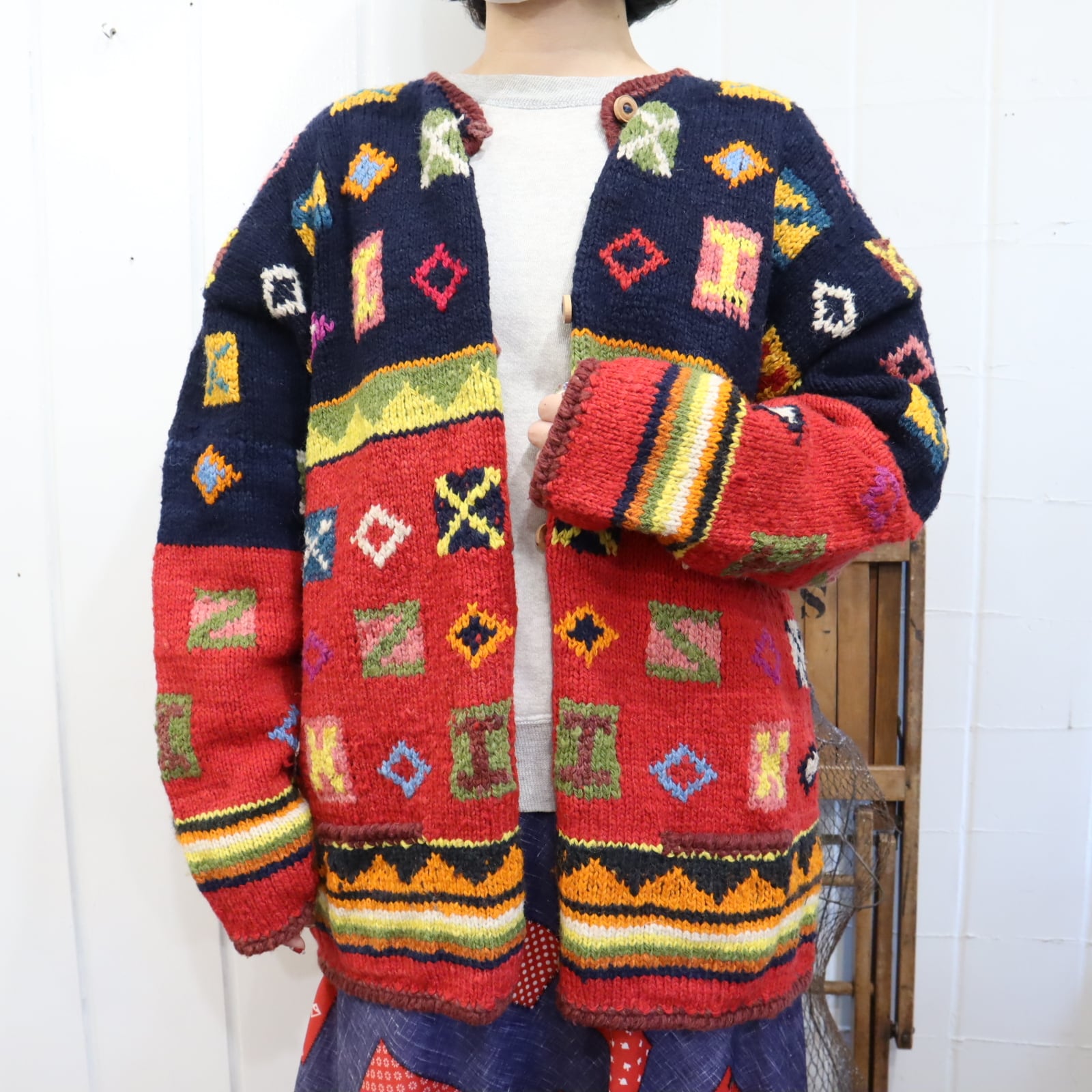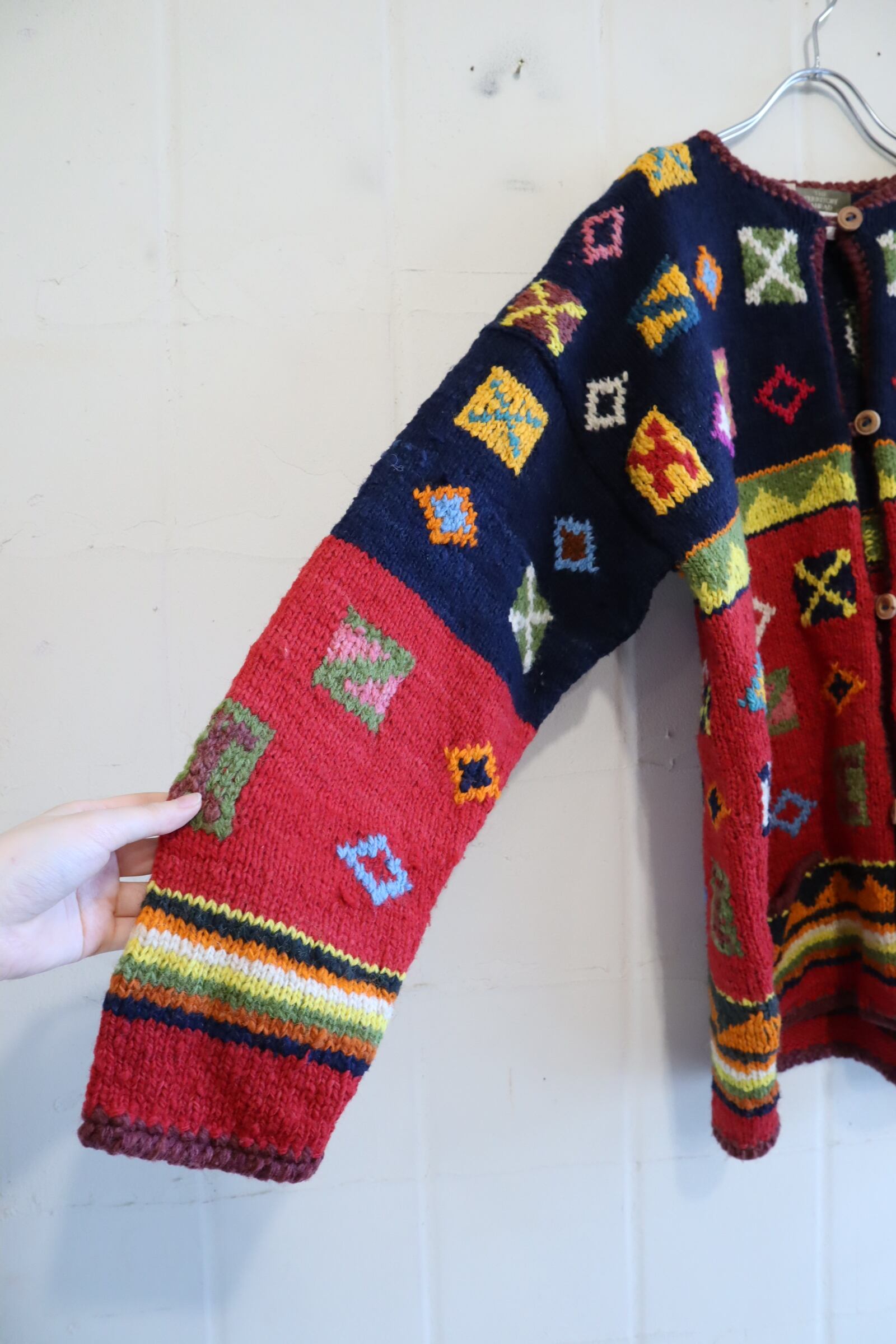 navy×red diamond&alphabet knit cardigan [l-2293]