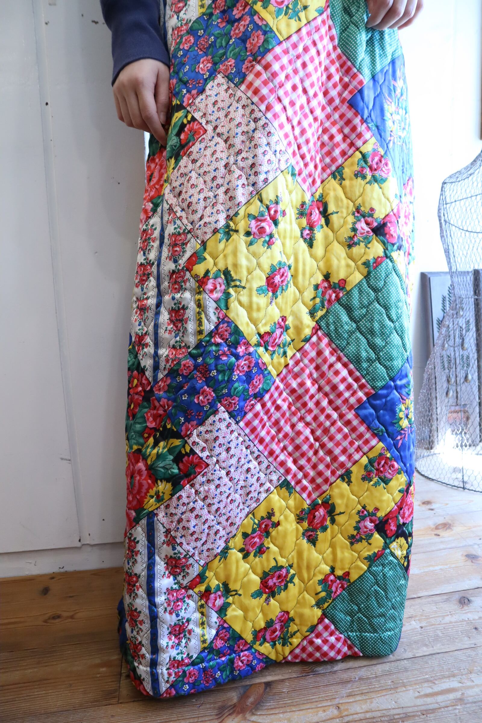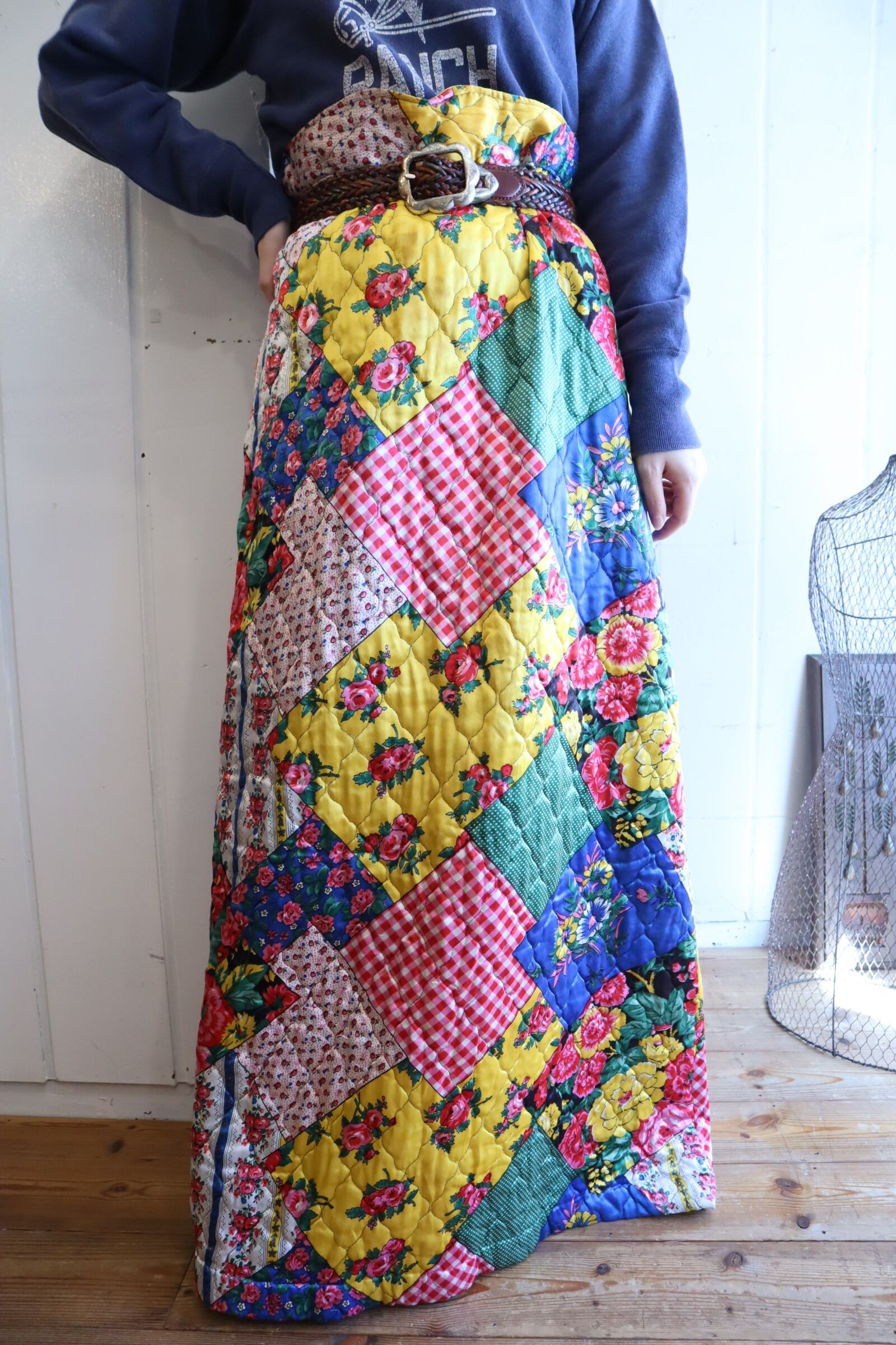 70s yellow×pink flower patchwork print quilting skirt [l-2309]