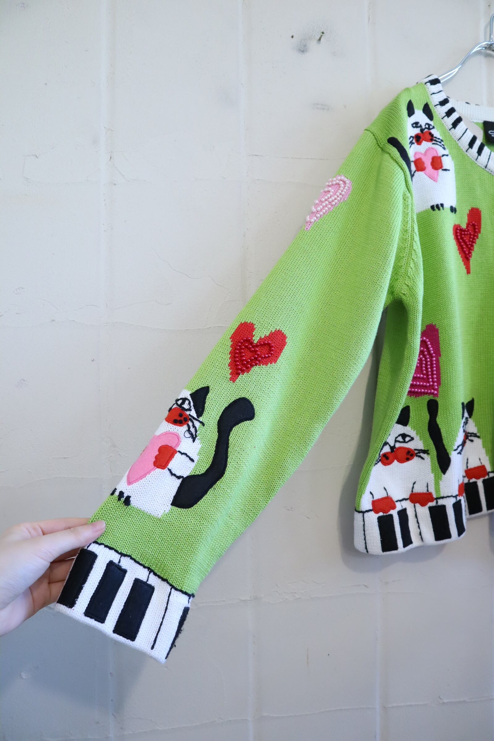 limegreen×white×black cat motif cotton knit cardigan [l-2315]