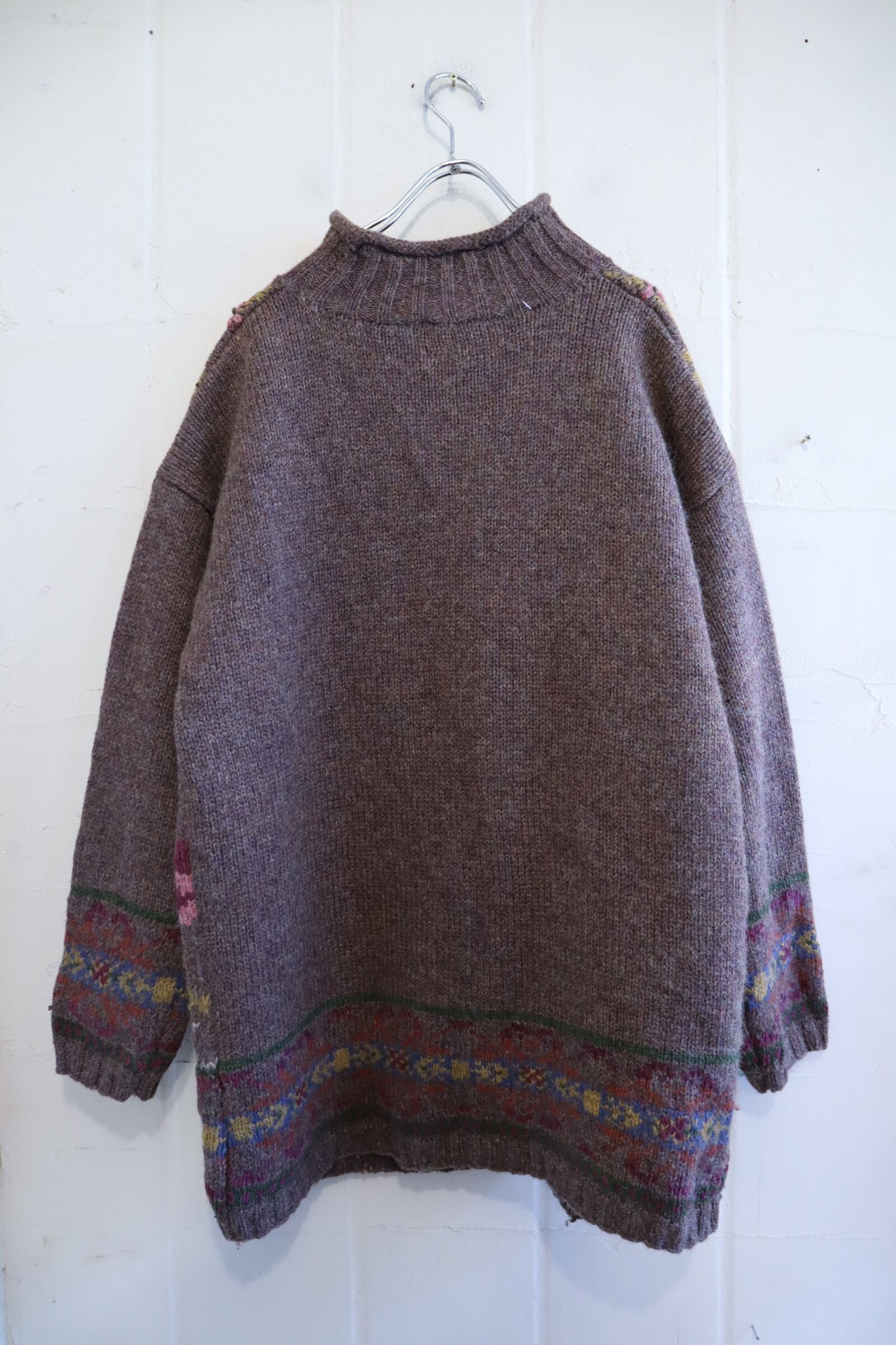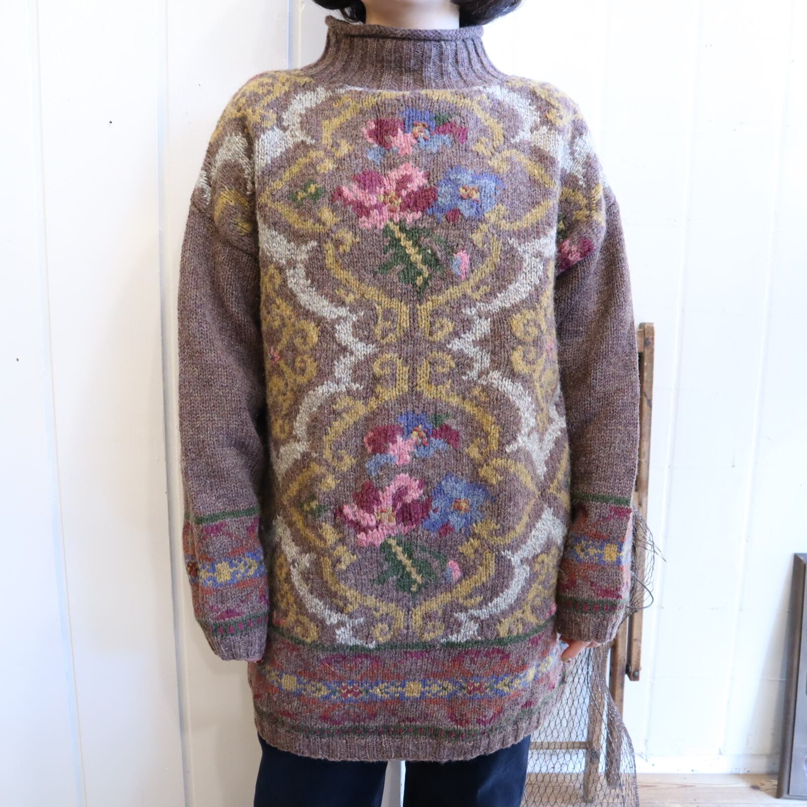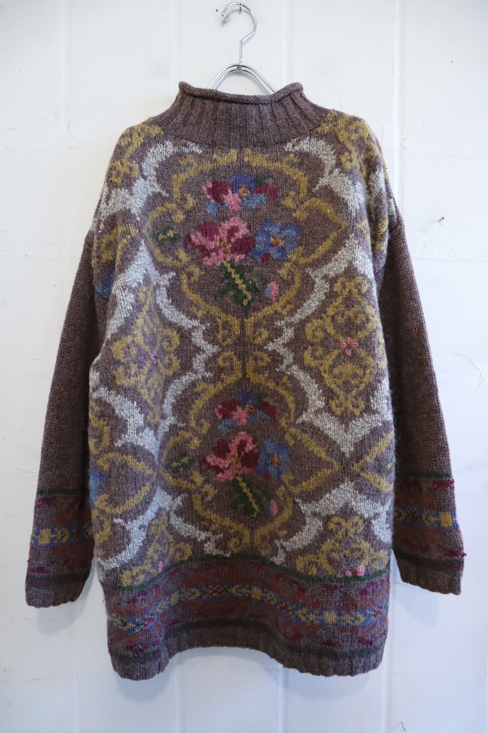 brown×pink flower stand collar hand knit pullover [l-2347]
