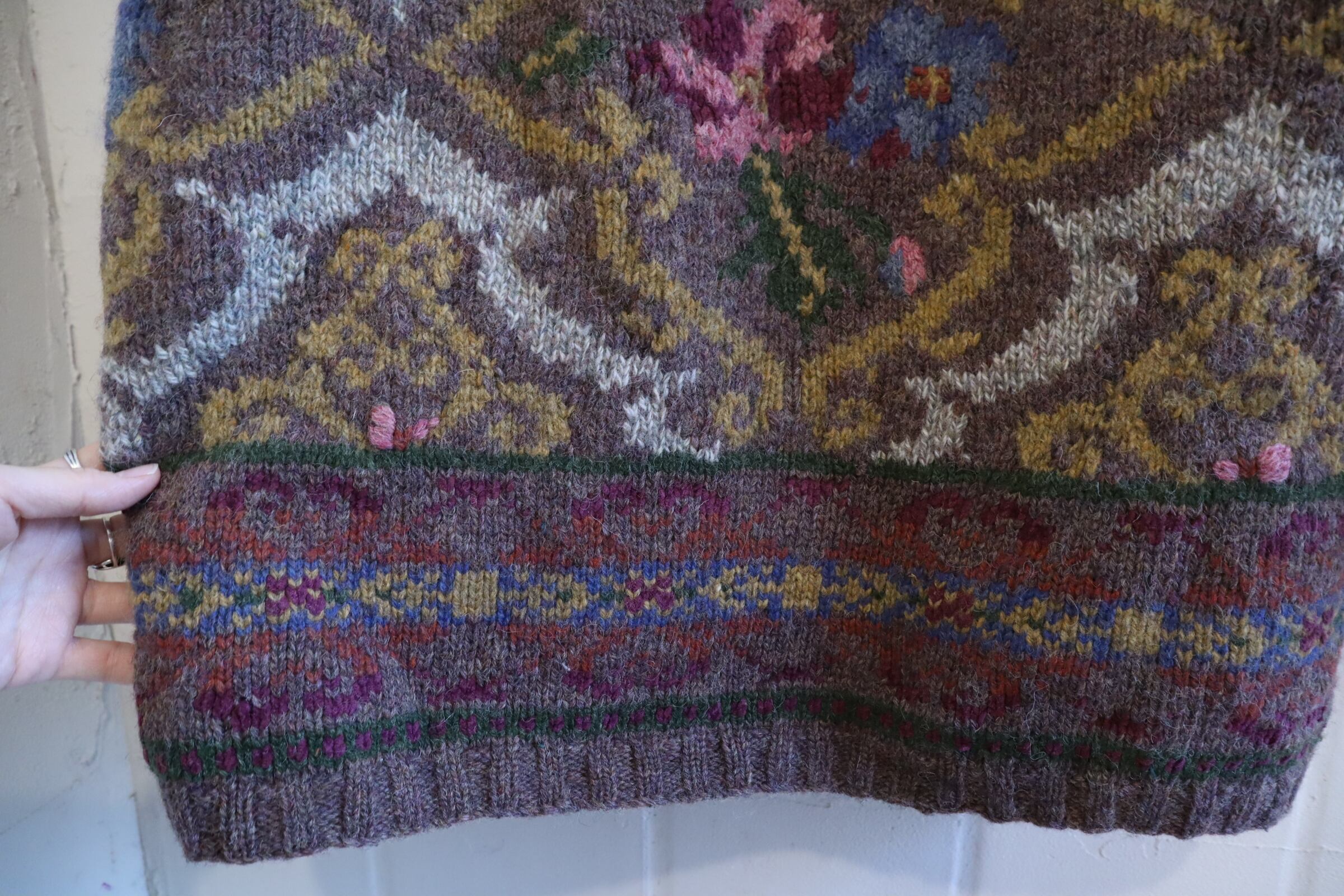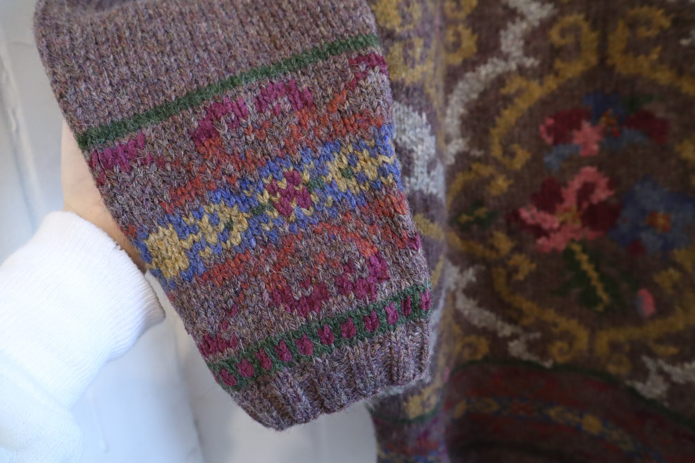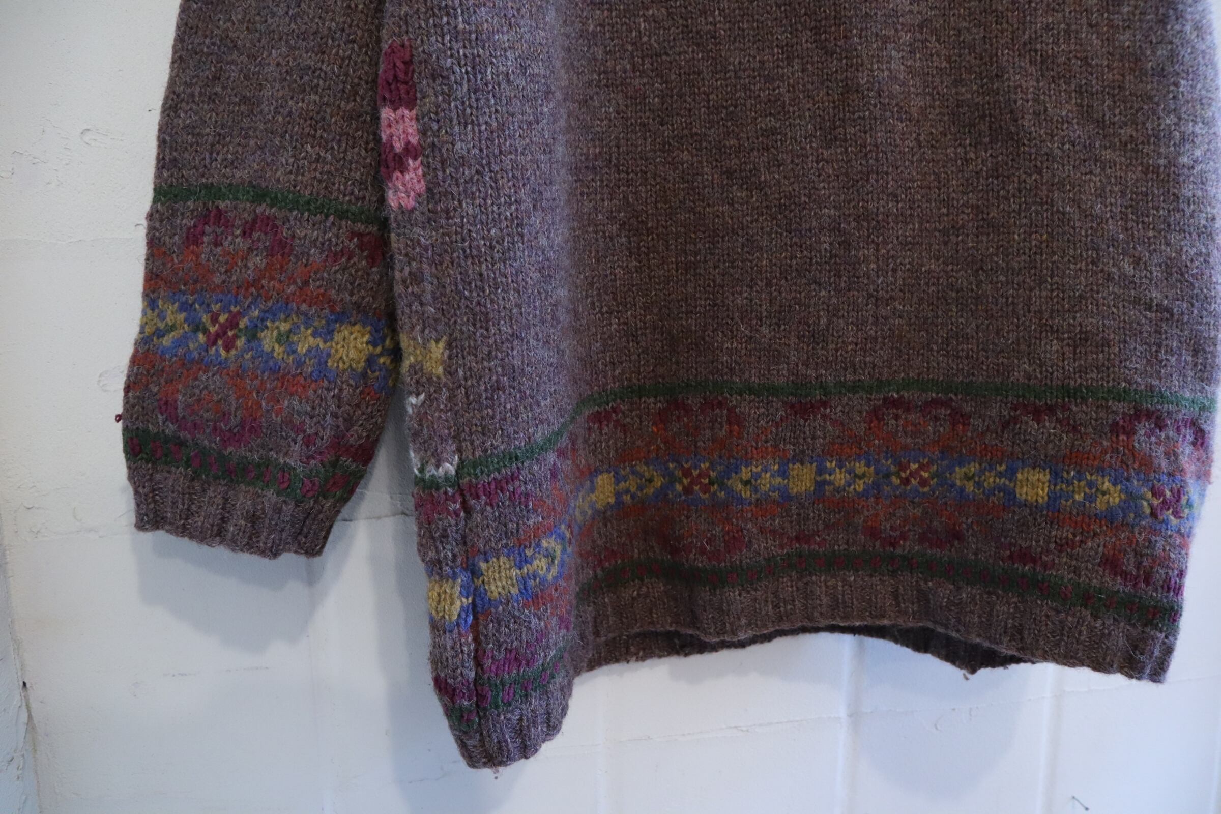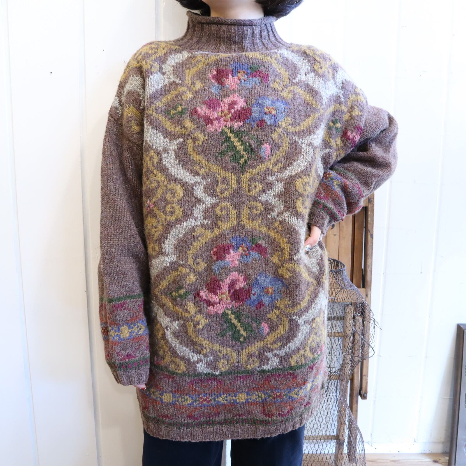 brown×pink flower stand collar hand knit pullover [l-2347]