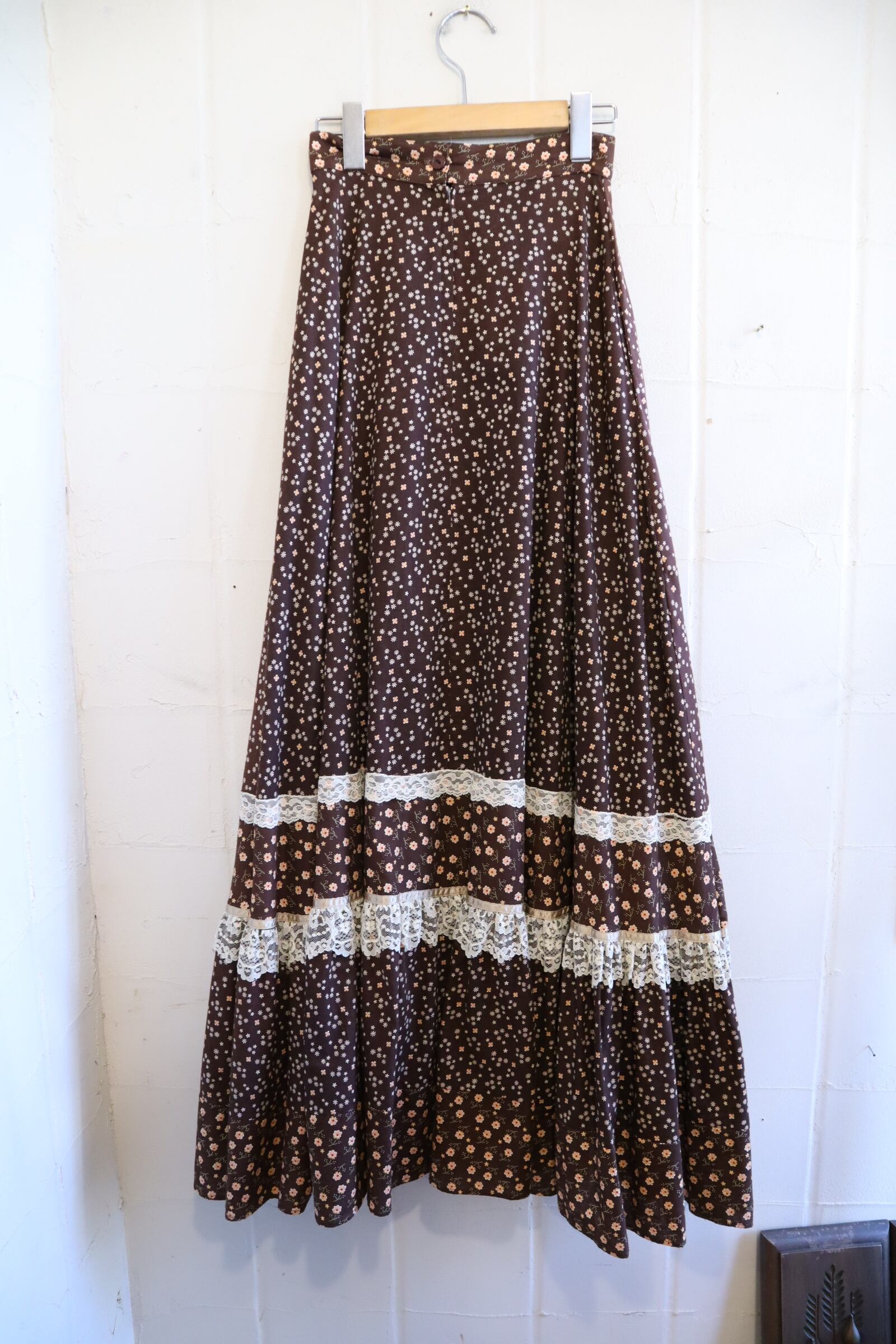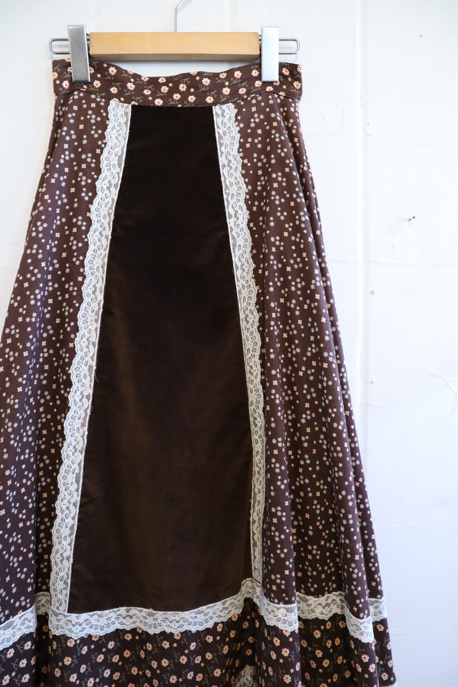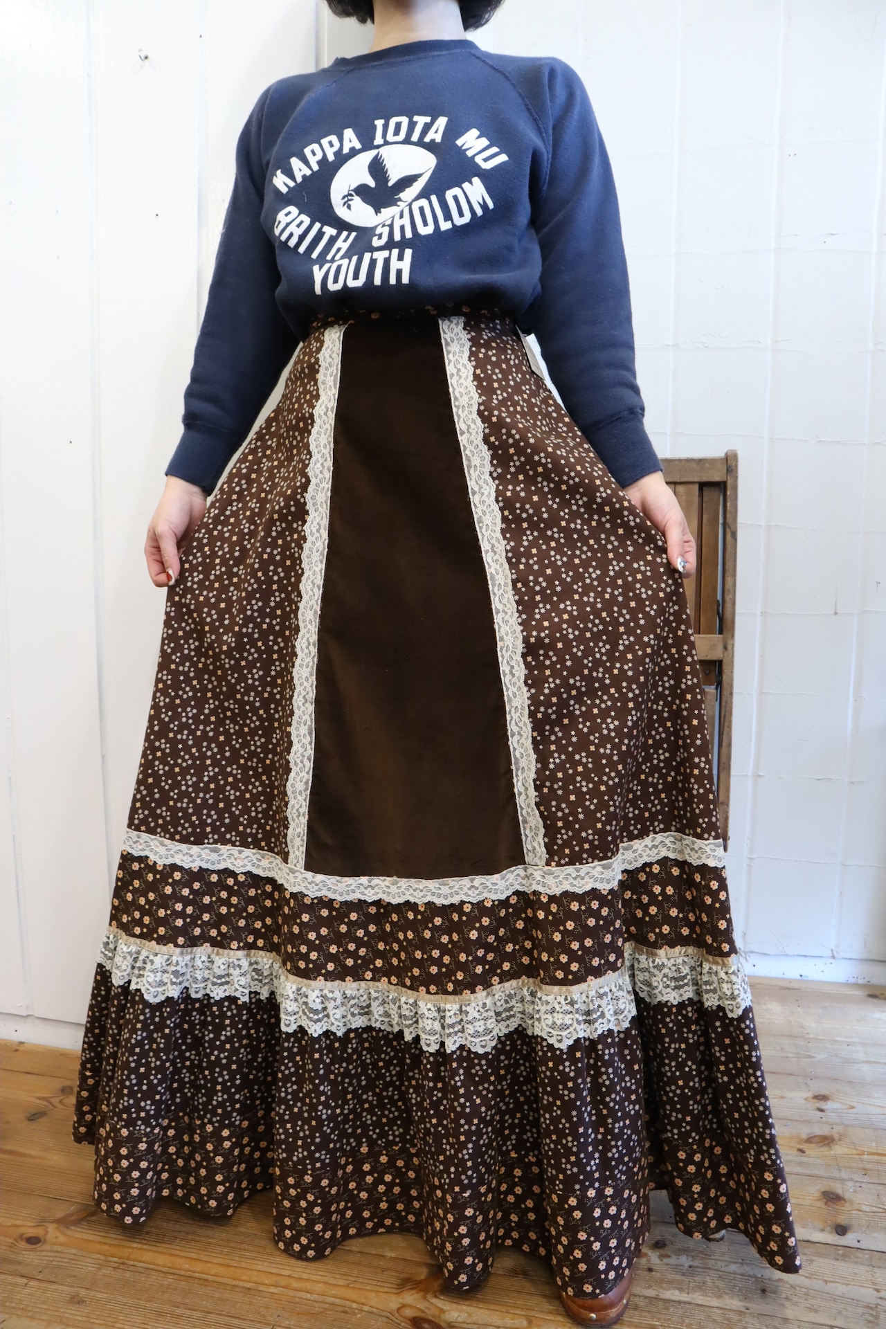 70s GUNNE SAX brown×white velour switching long skirt [l-2352]