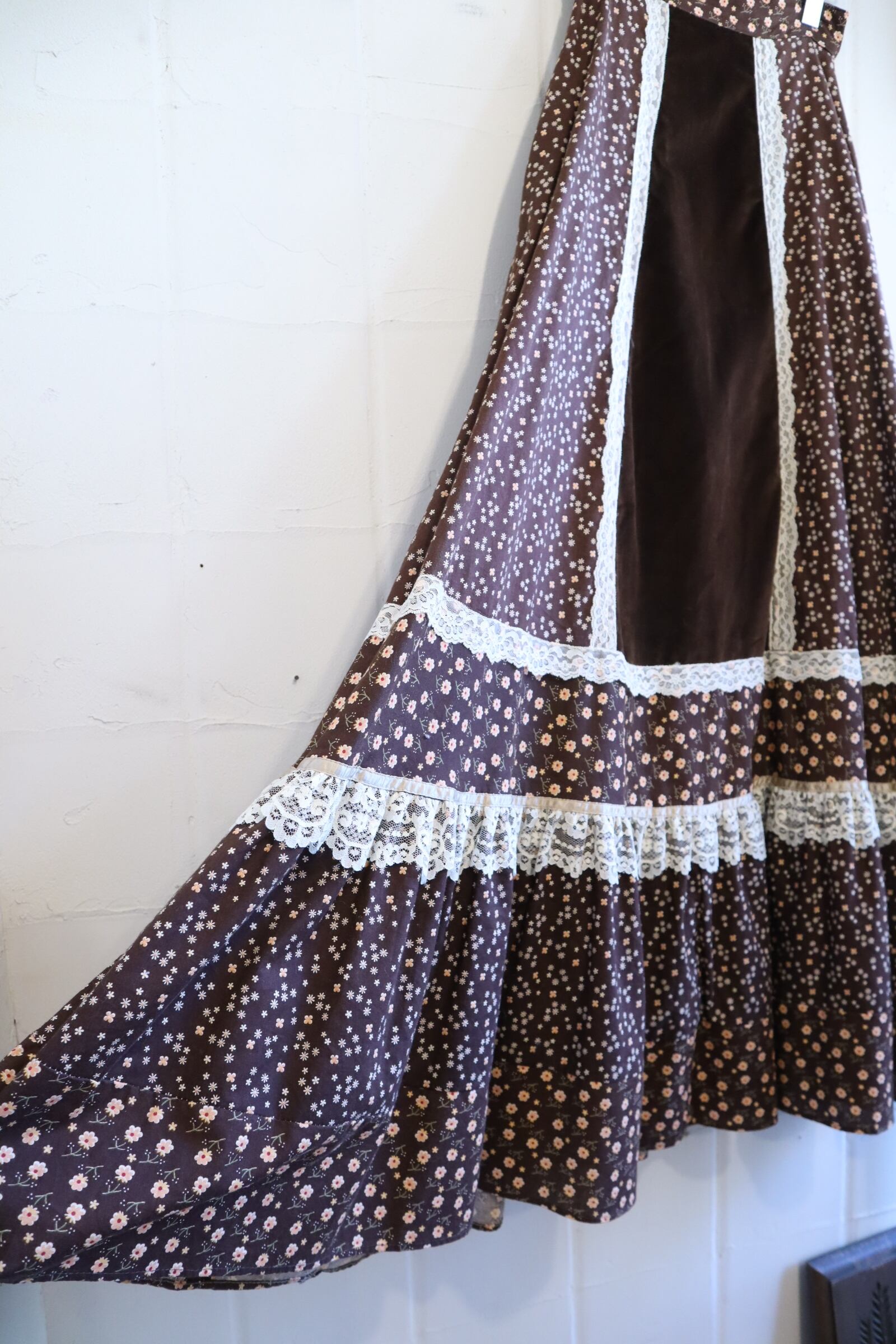 小花柄とベロアやレース素材が素敵なガニーサックスのロングスカート。