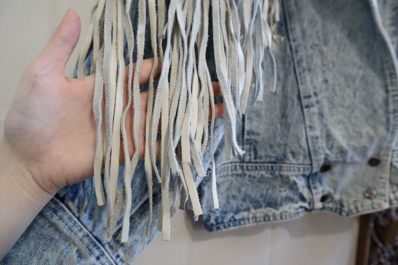 80s lightblue leather fringe chemicalwash denim jacket [l-2369]