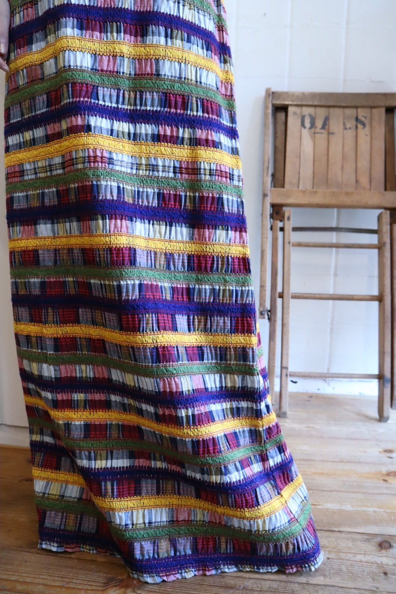 70s navy×yellow plaid&border long skirt [l-2381]