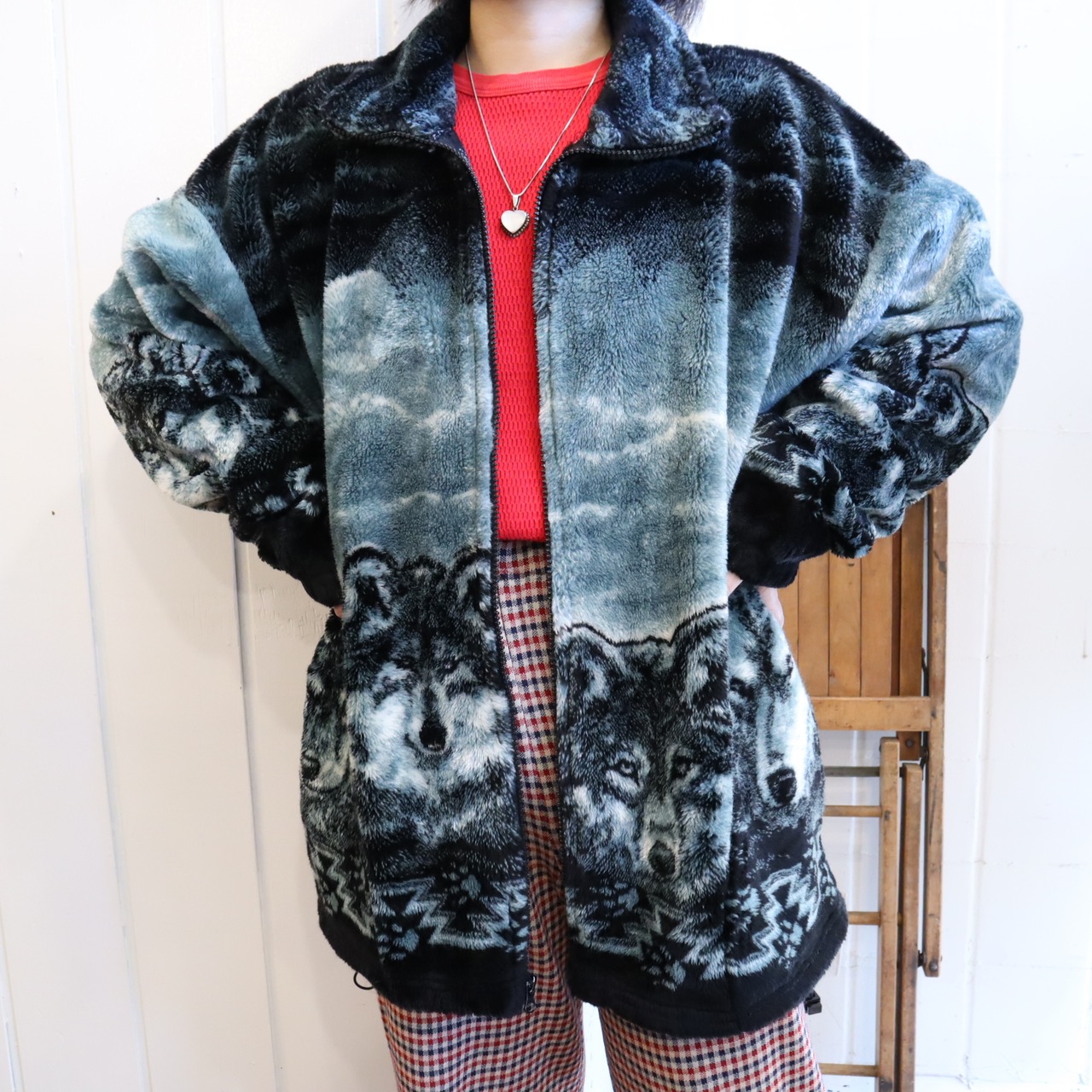 made in USA grayblue×black wolf print fleece jacket [l-2398]