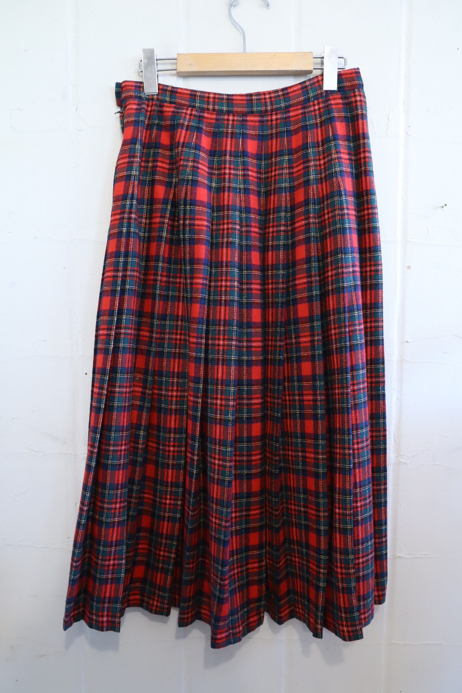 70s PENDLETON red×green plaid pleats wool skirt [l-2405]