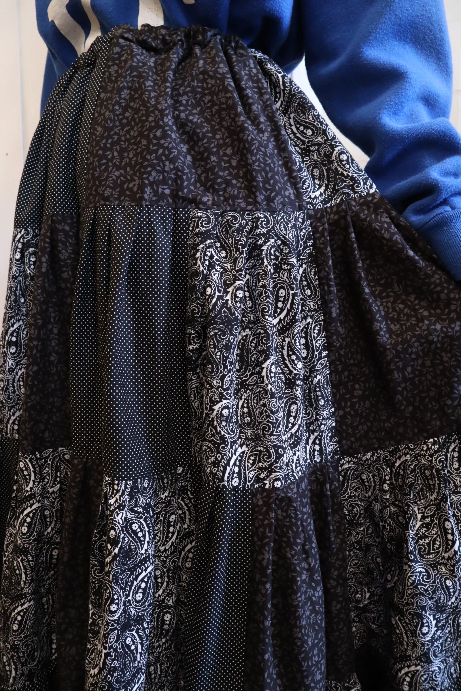 生地が贅沢に使われた、たっぷりなシルエットが素敵なパッチワークスカート。