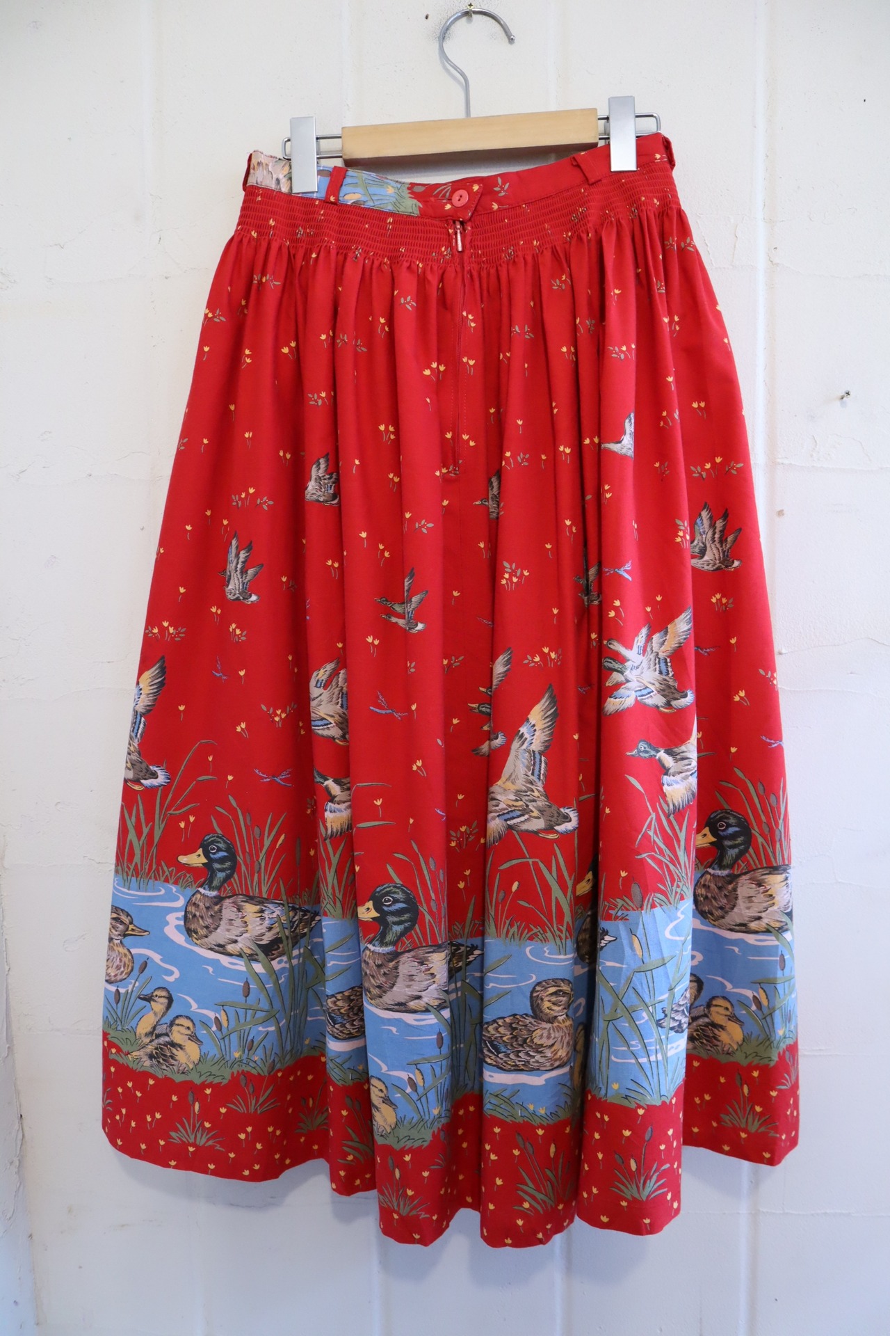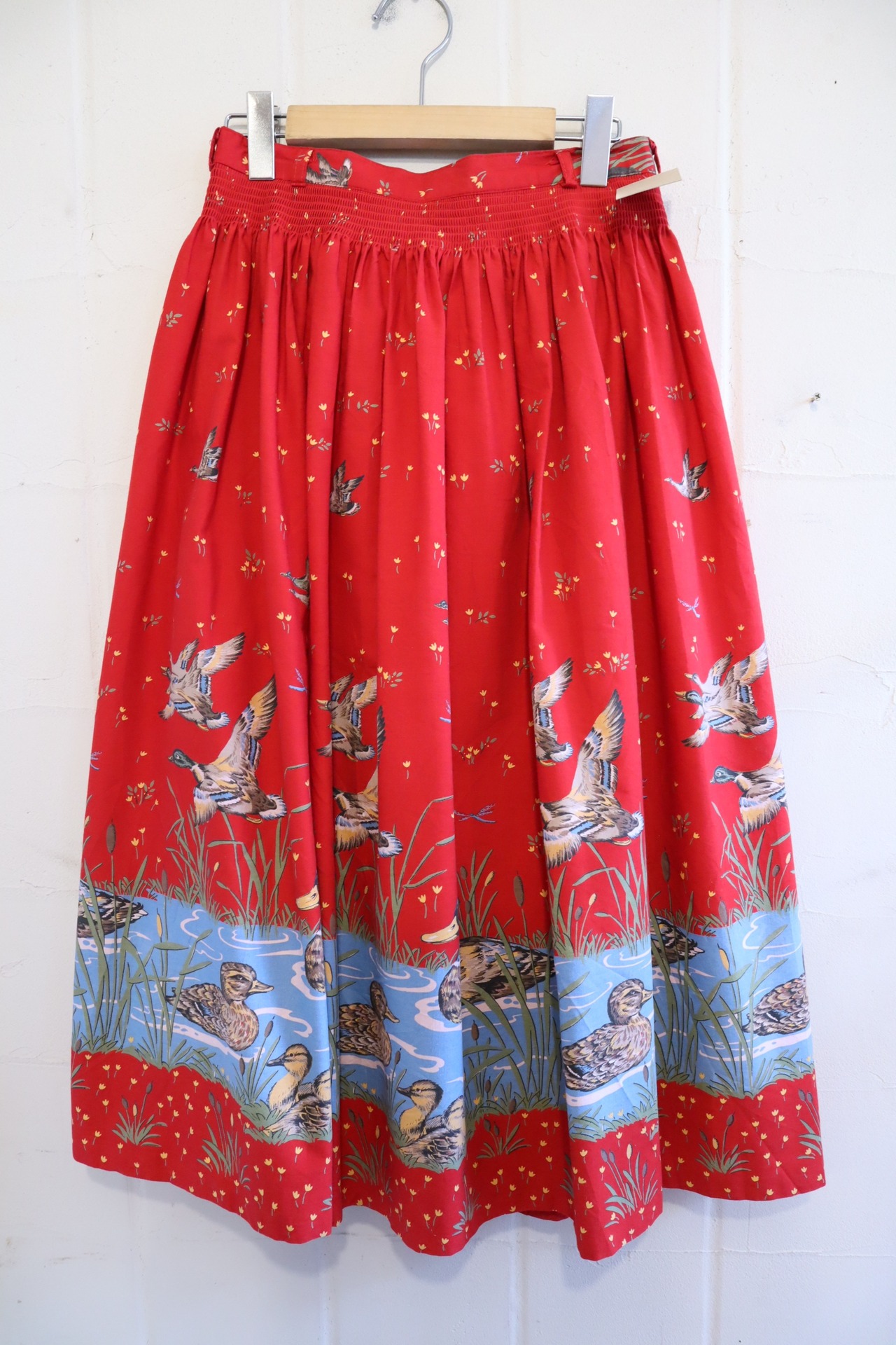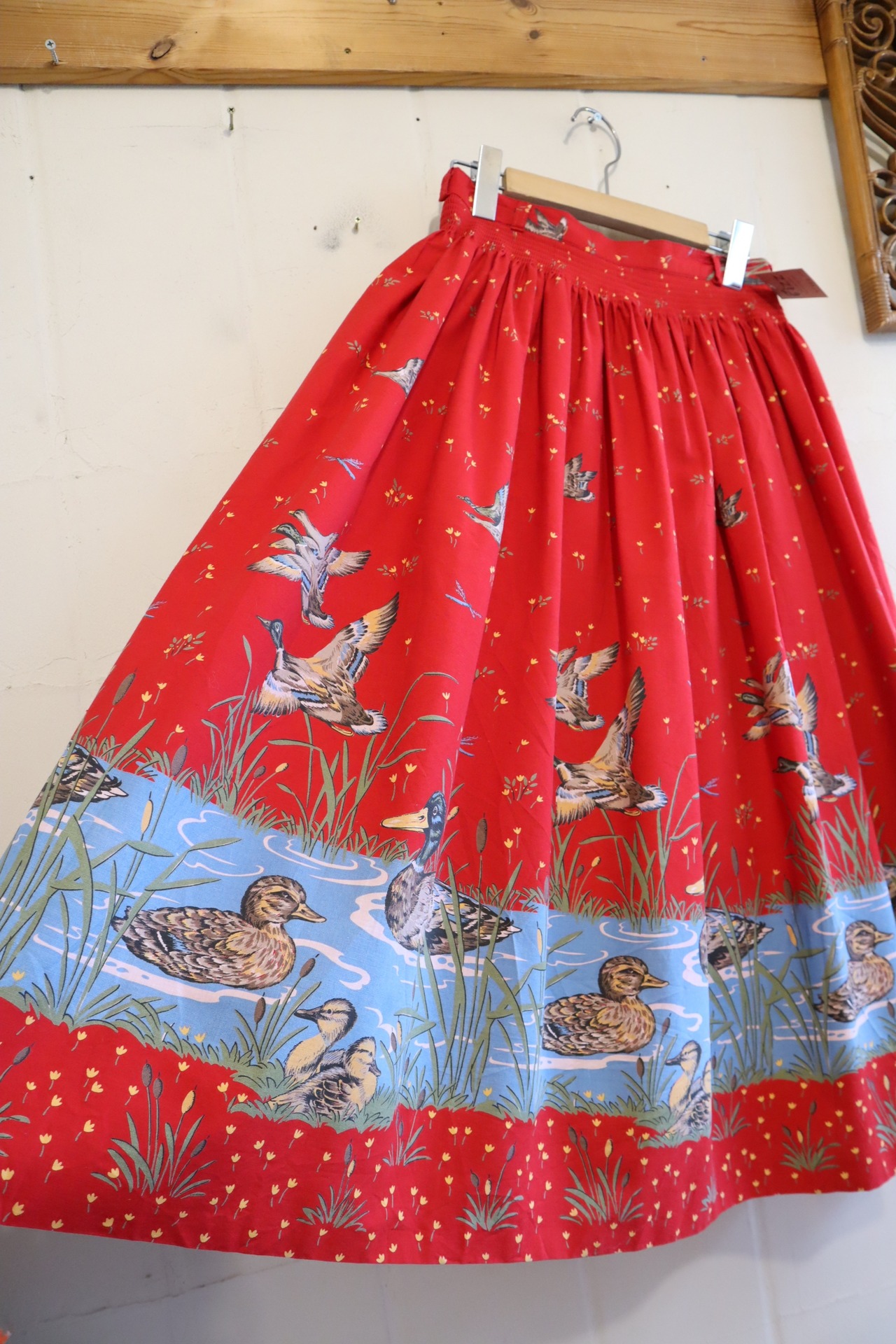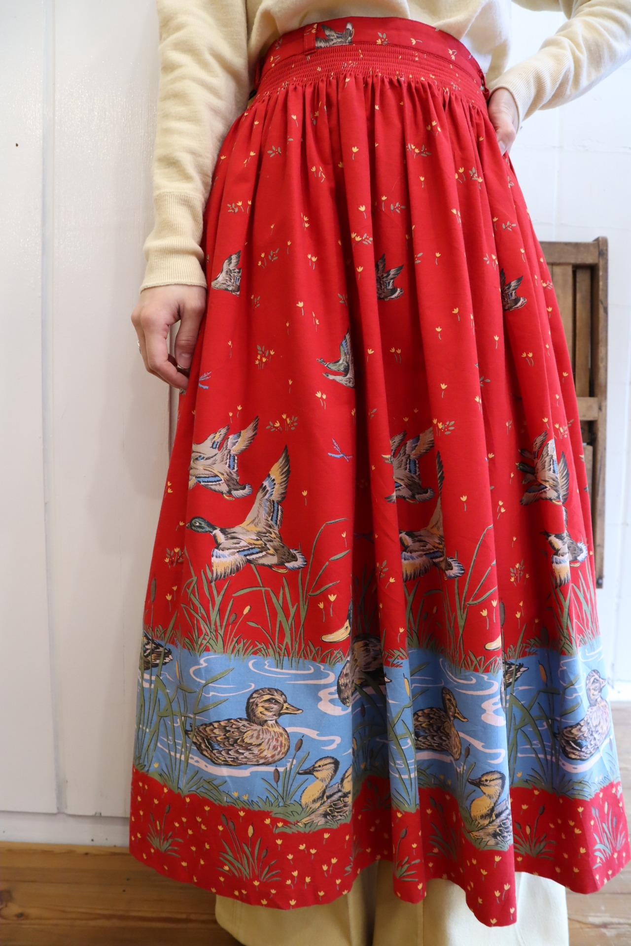 カモが飛んでいたり泳いでいたり日常を切り取ったようなテキスタイルが素敵なチロルスカートです♡こちら人気の高い一枚かと思います♡