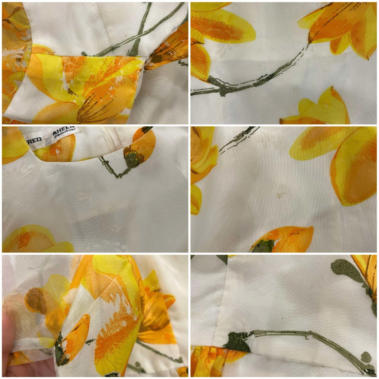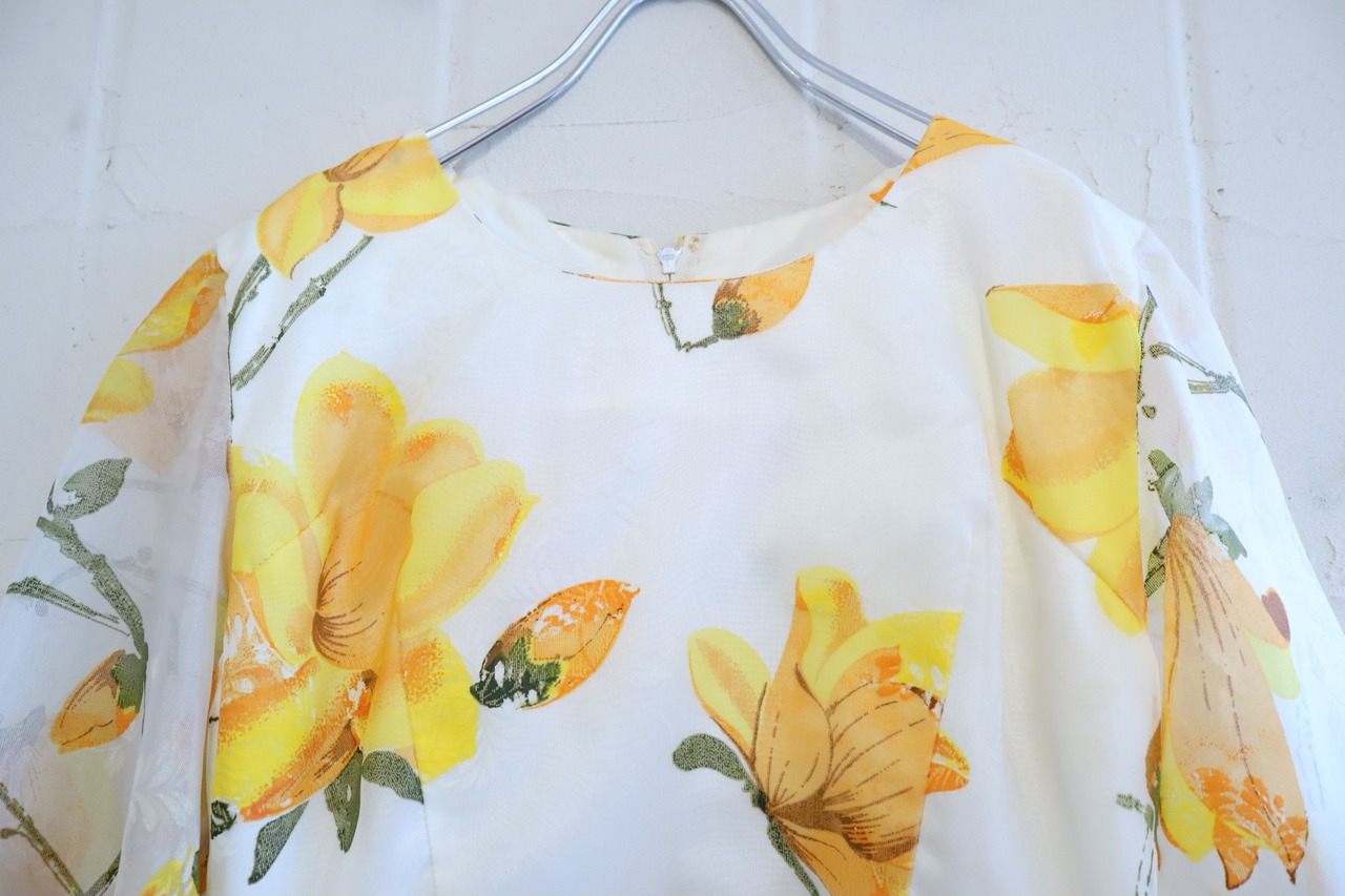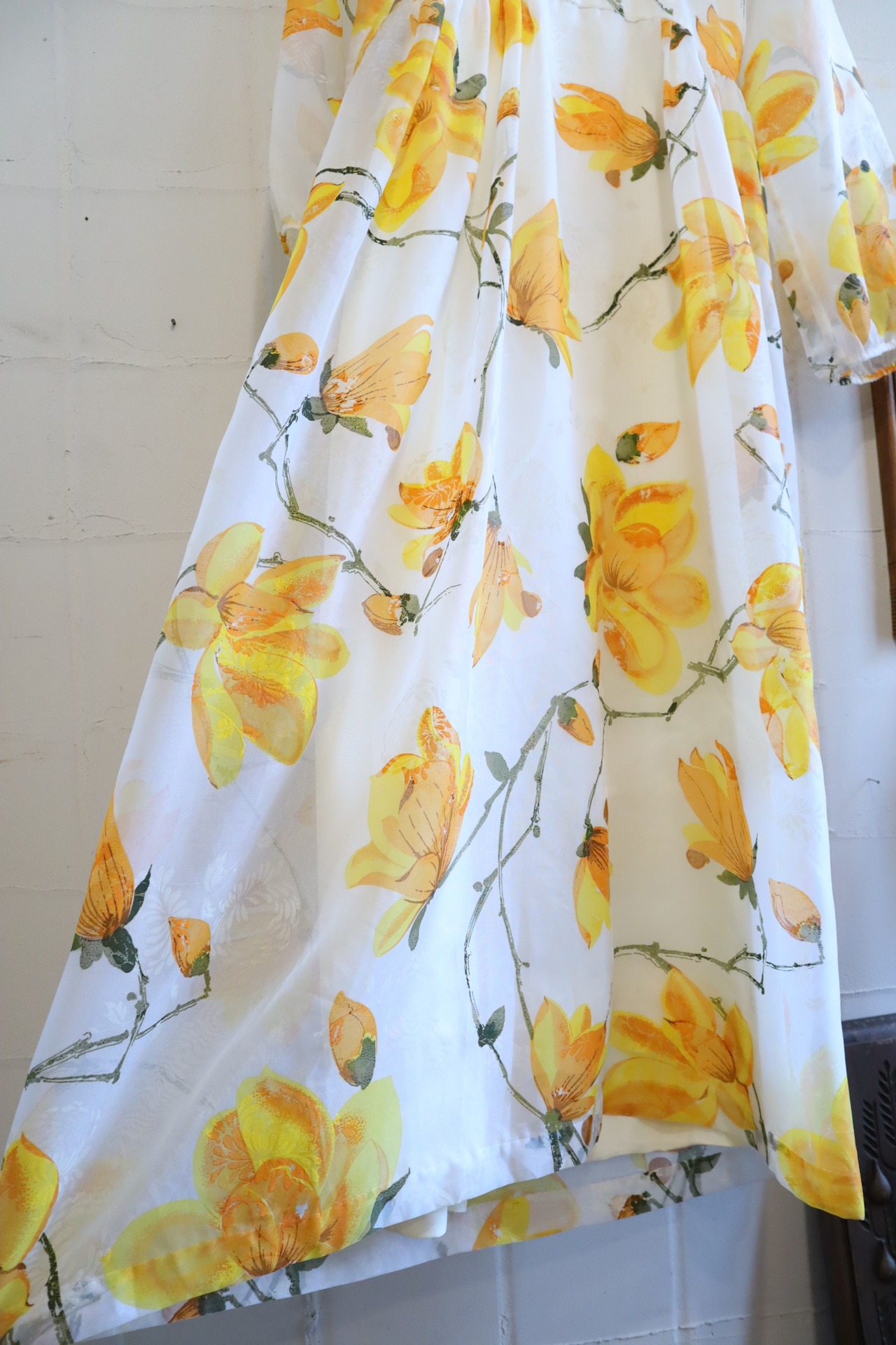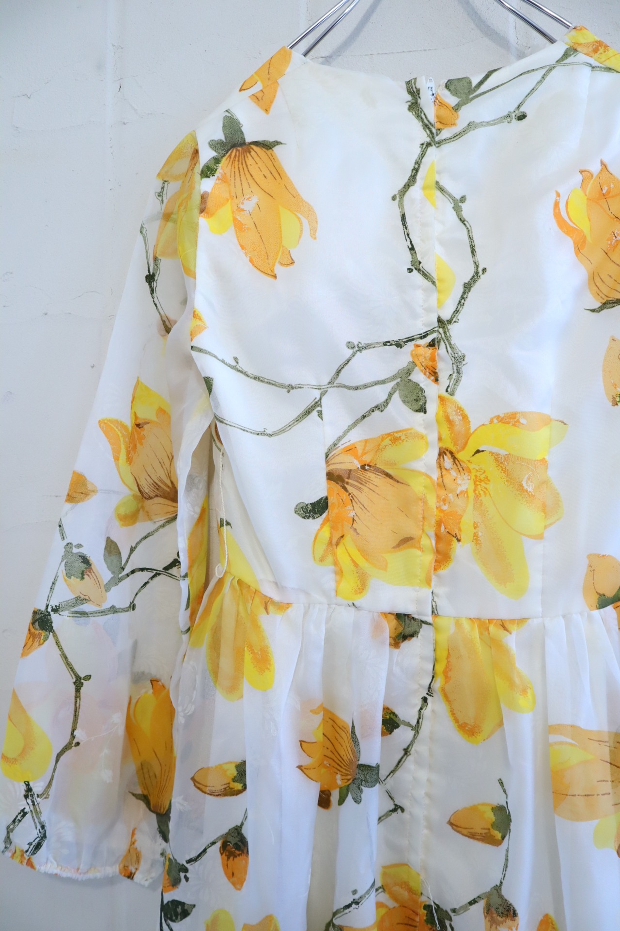 70s white×yellow flower pattern leaf flockyprint dress [l-2461]