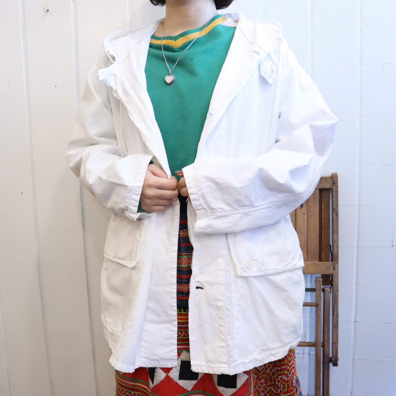 春のライトアウターとしても活躍しますし、白無地の為柄物やデニムなど色々なアイテムと相性良く着こなすことができますよ。
