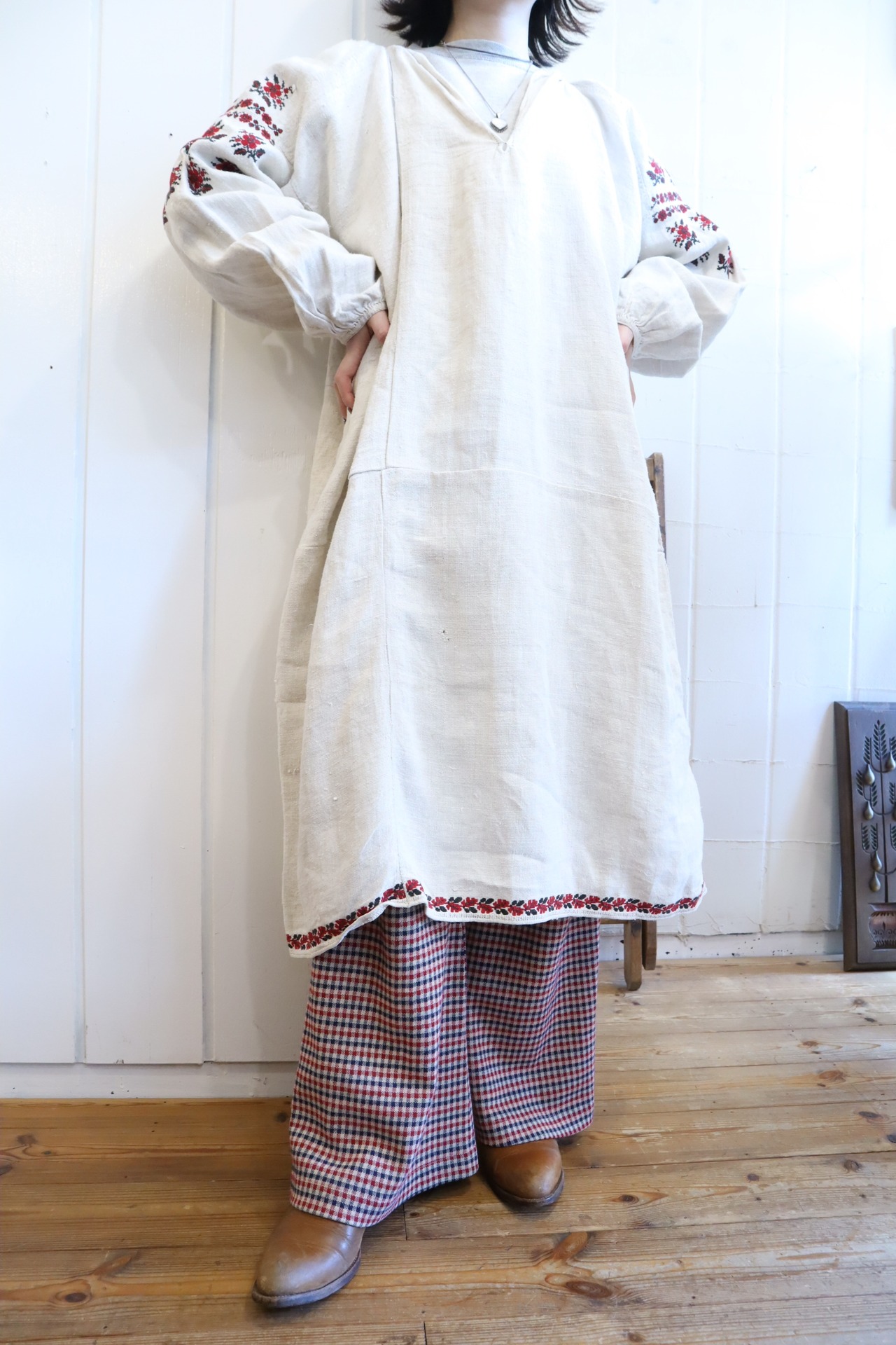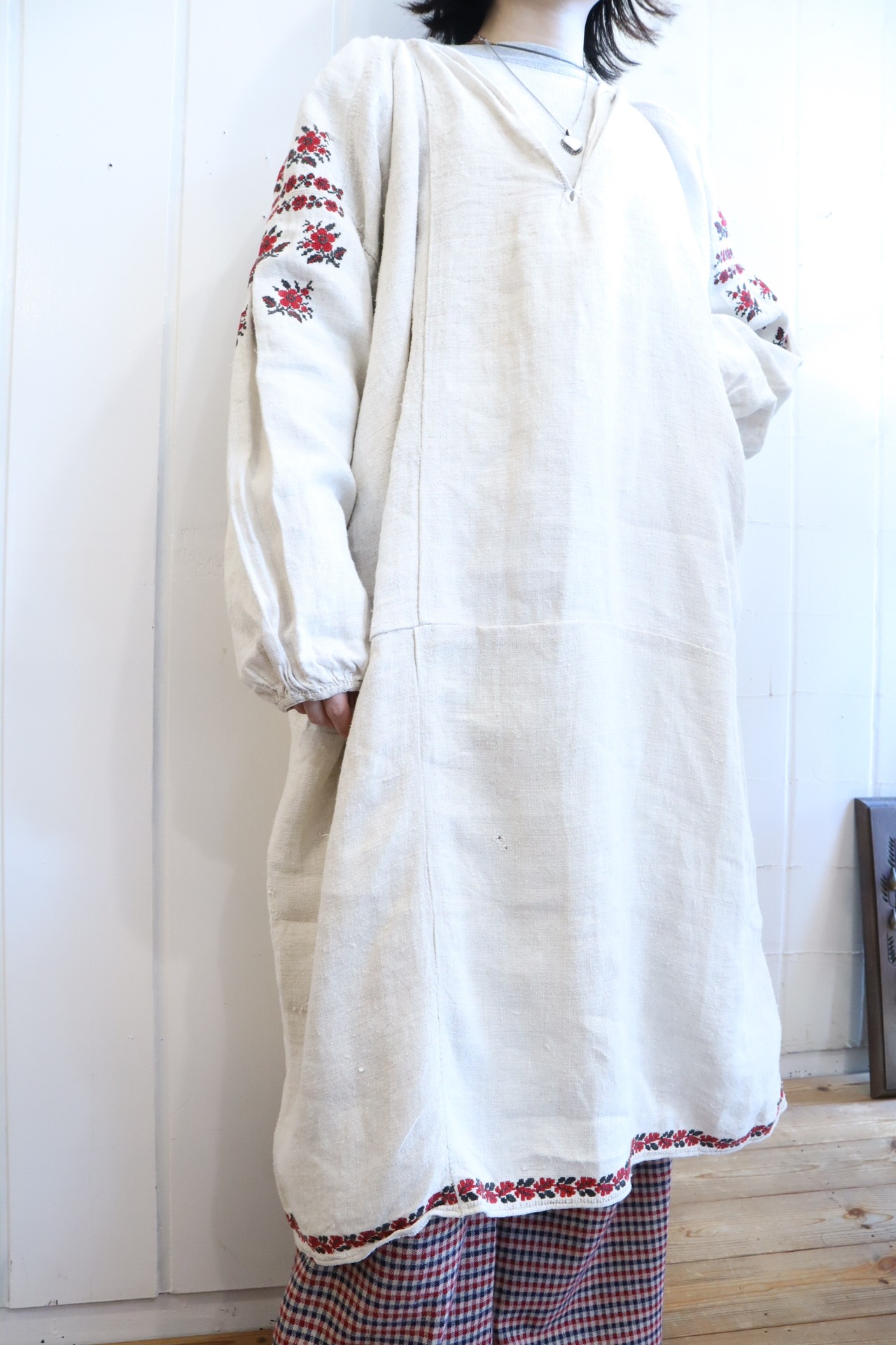 antique ecru×red×black flower embroidery ukraine dress [l-2528]