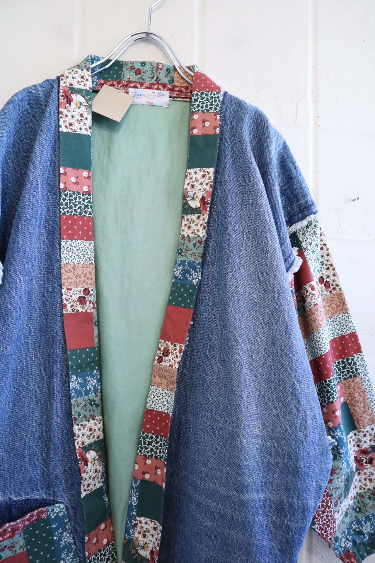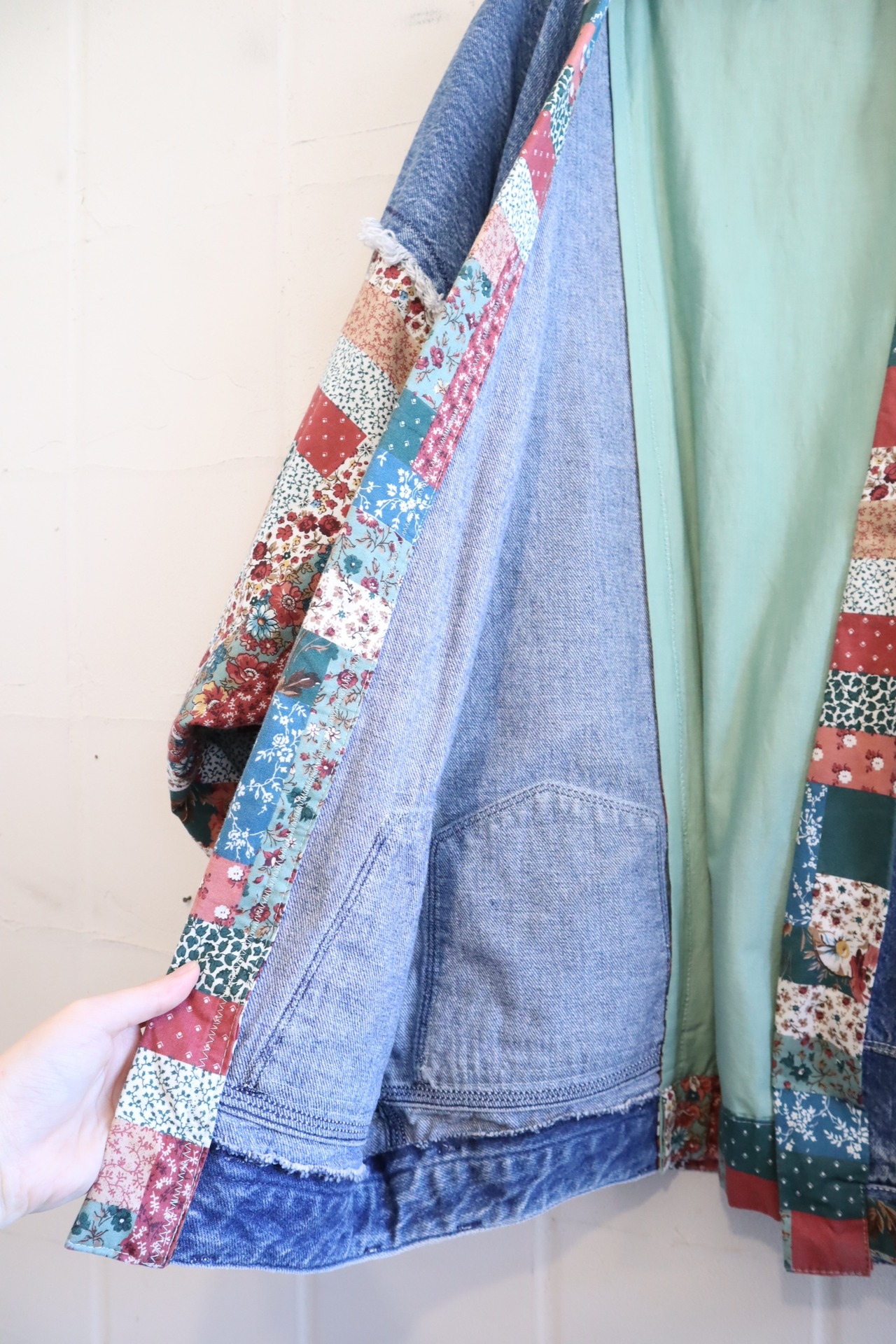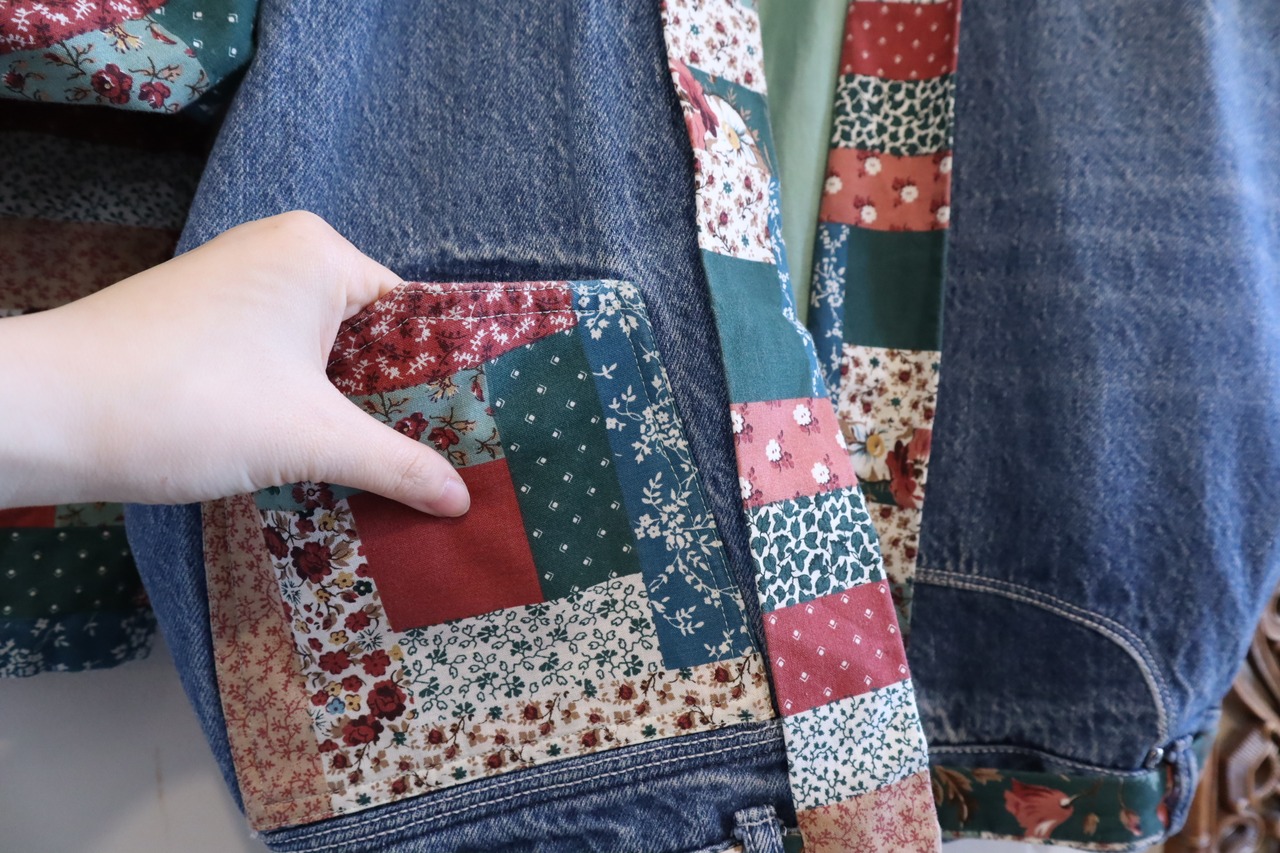 デニムパンツとパッチワーク柄の生地でリメイクされたデニムジャケットです。