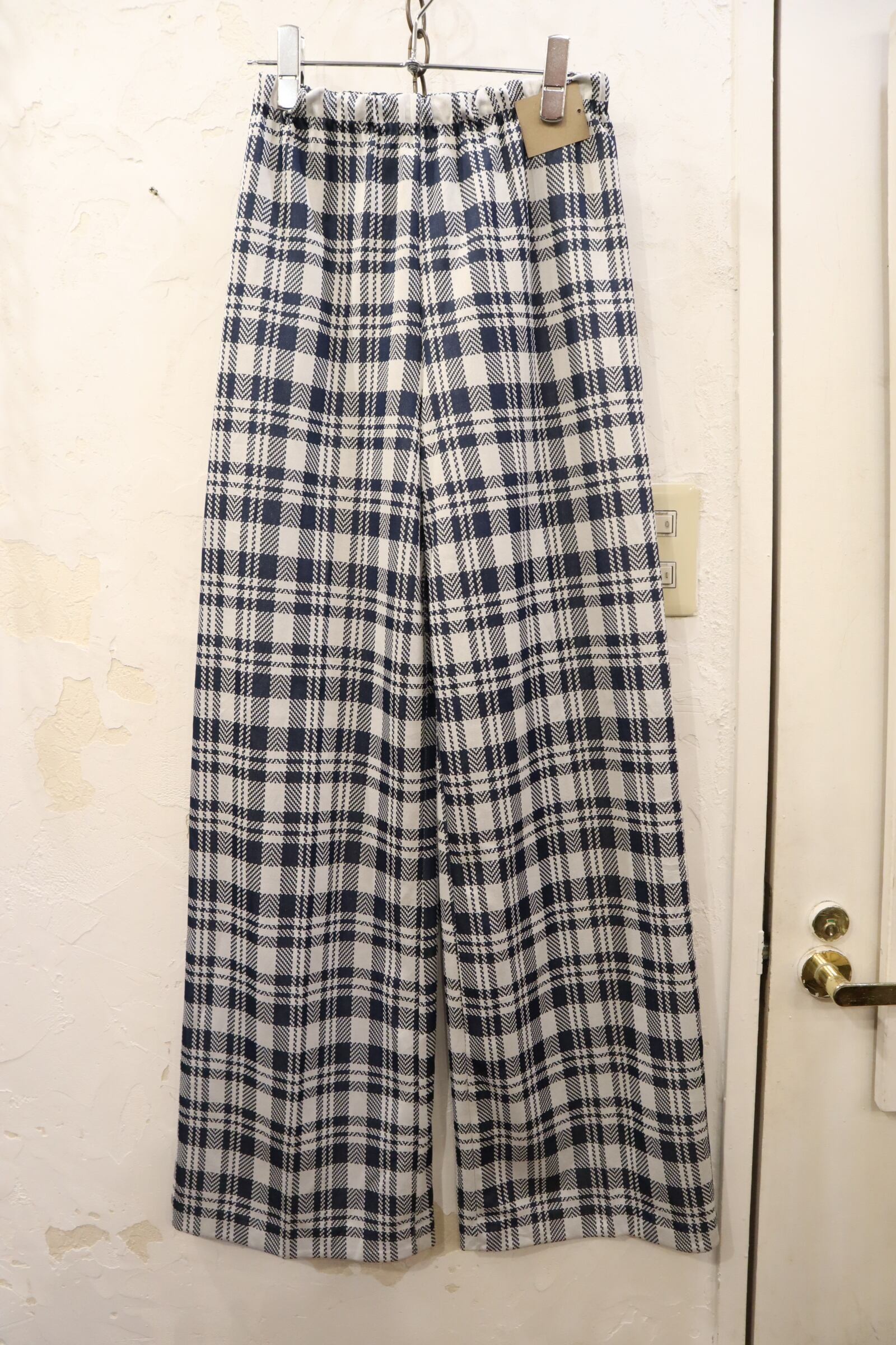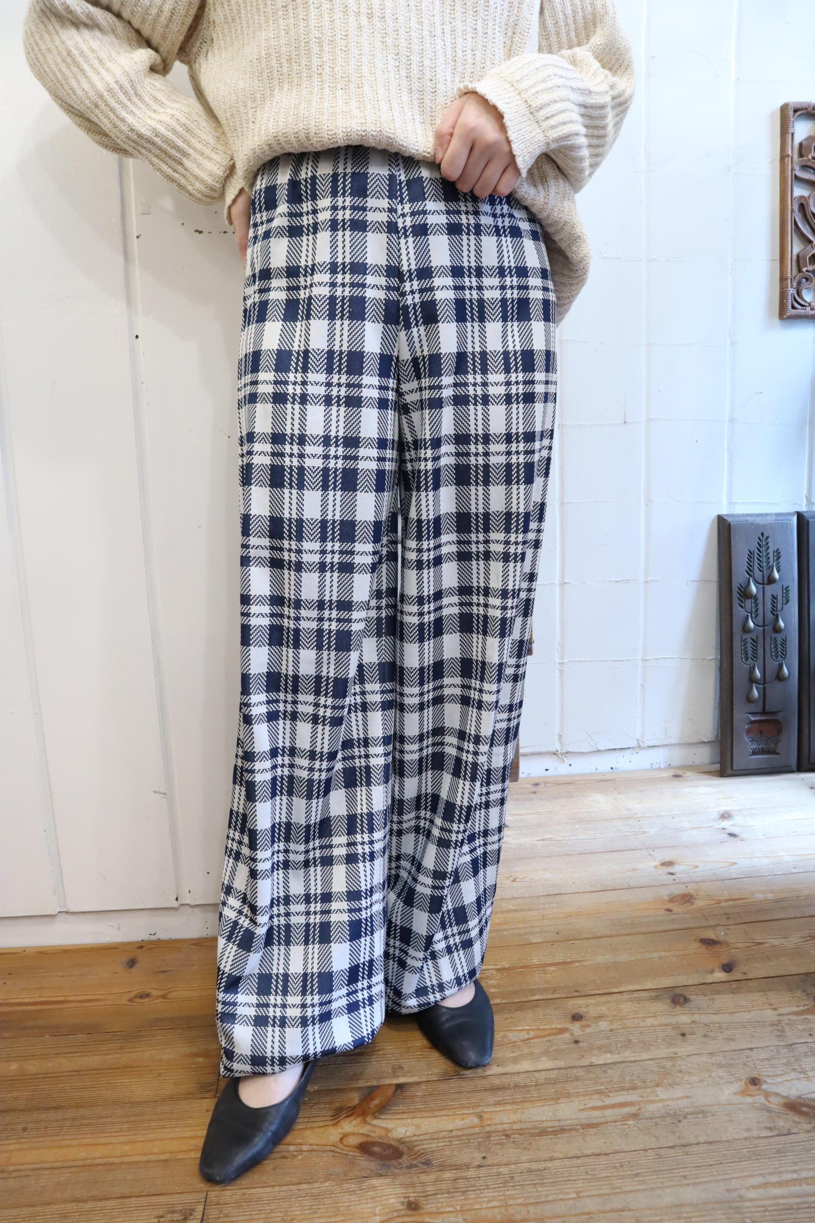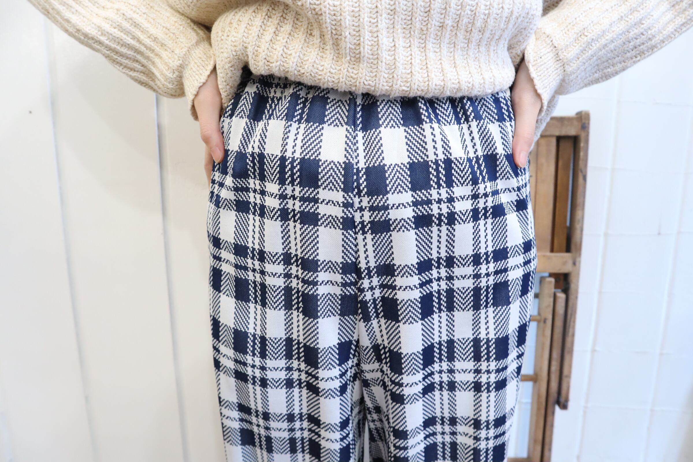 70s navy×white plaid polyester easy pants [l-2561]