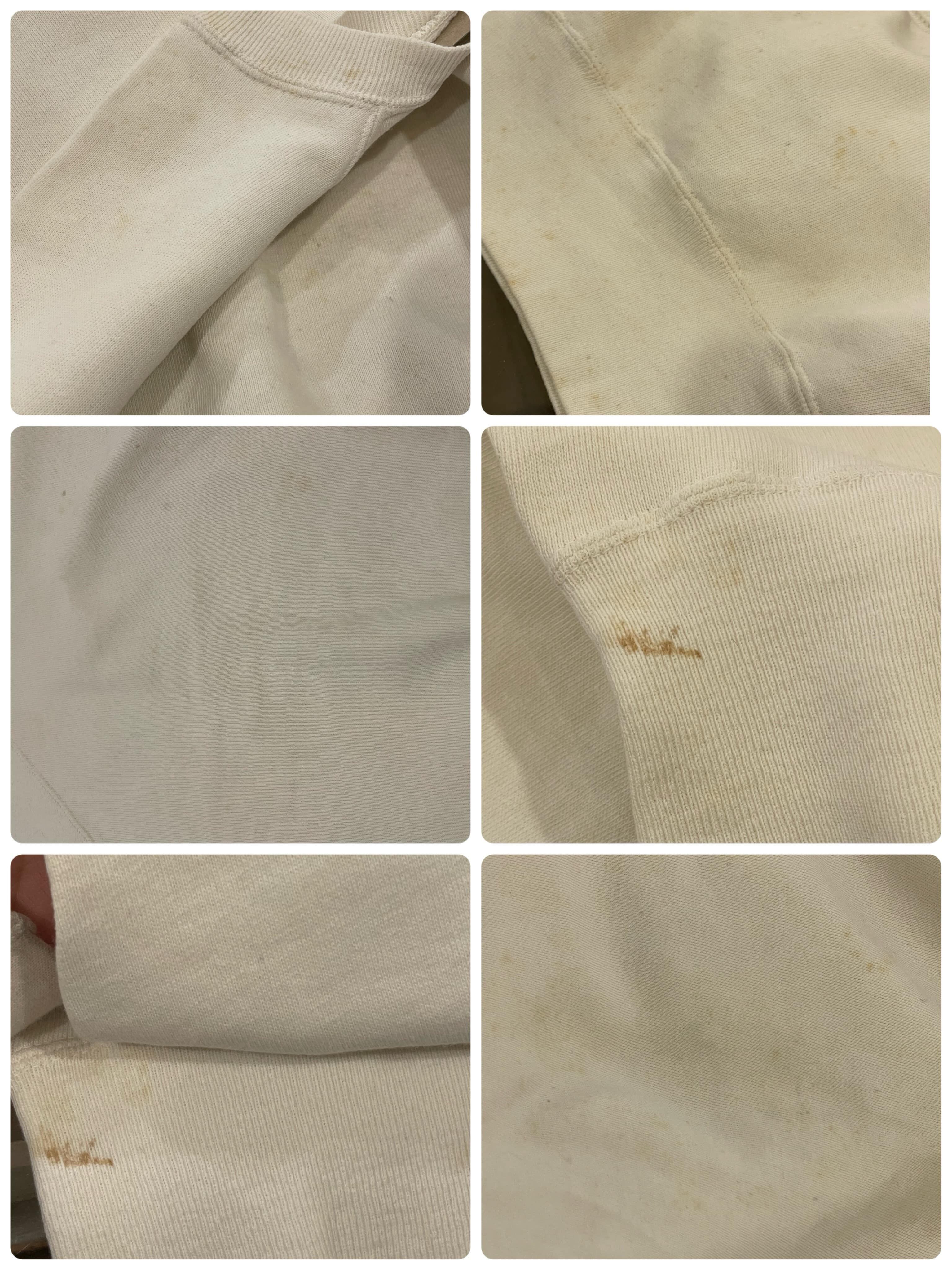 全体的にシミ汚れや汚れ、一部リブ部分の小さな破れや傷がございますが、古着の雰囲気として着て頂けるかと思われます。