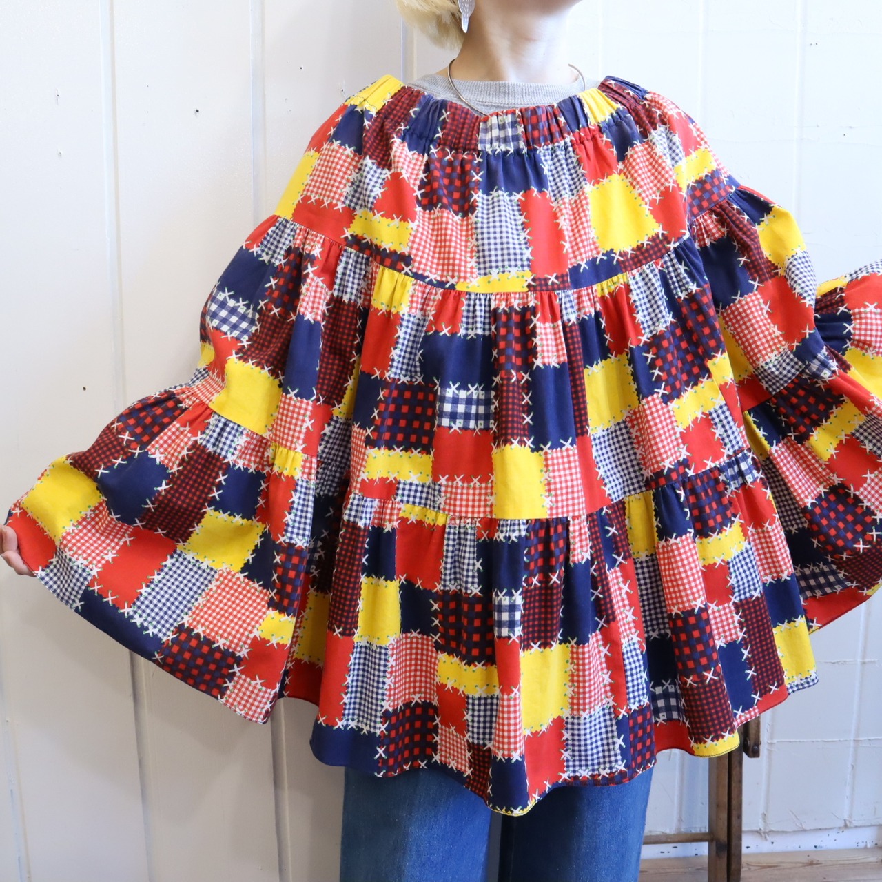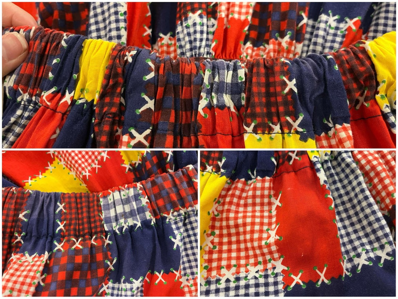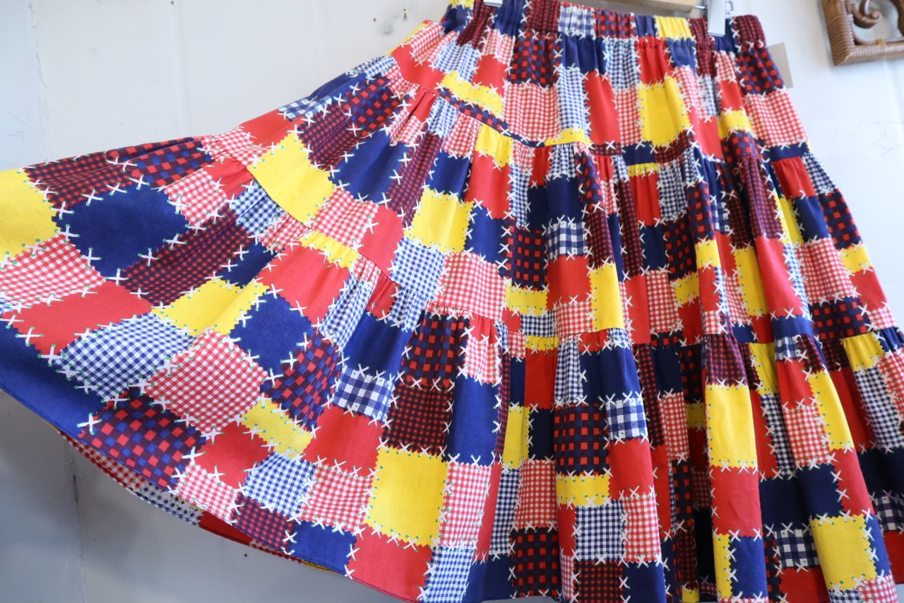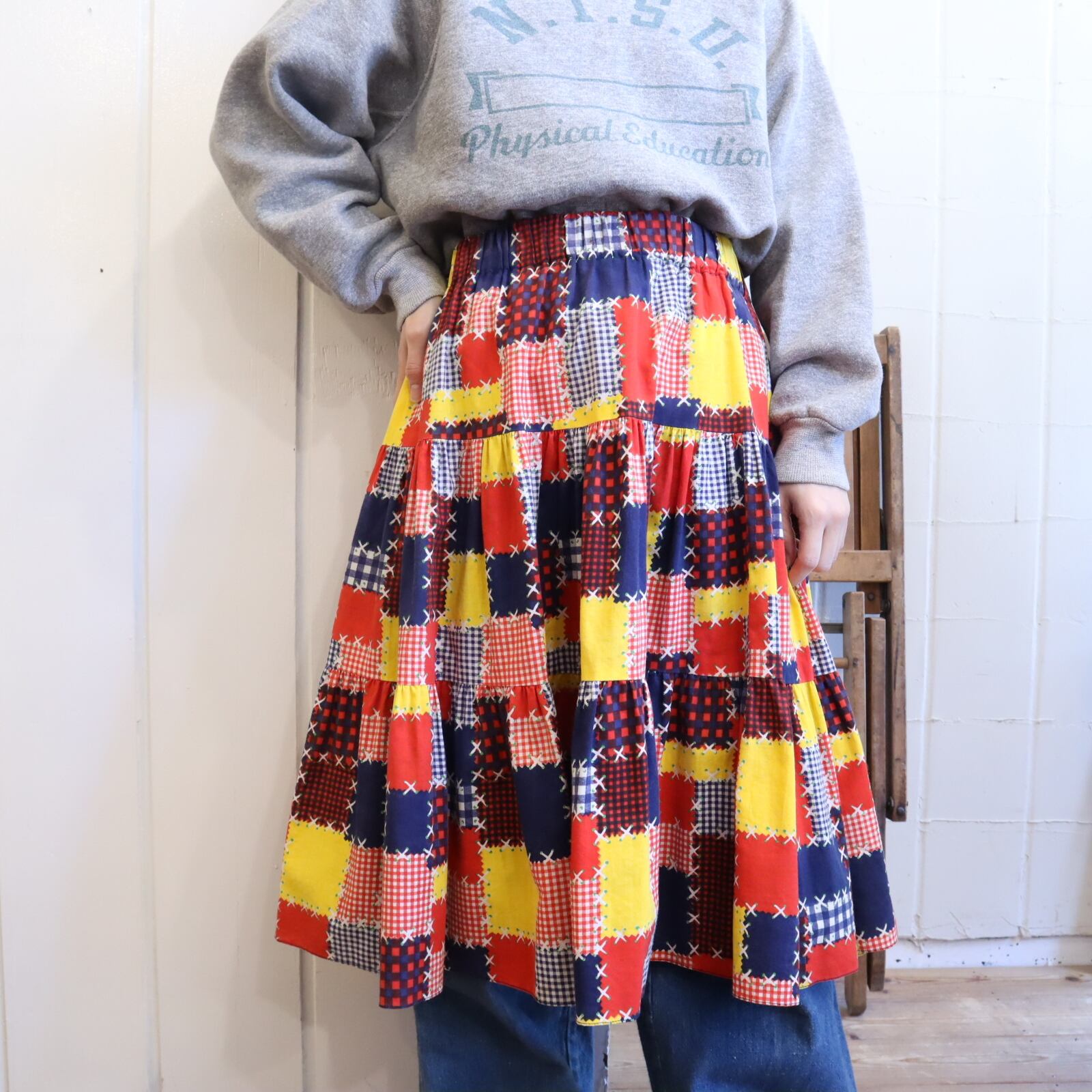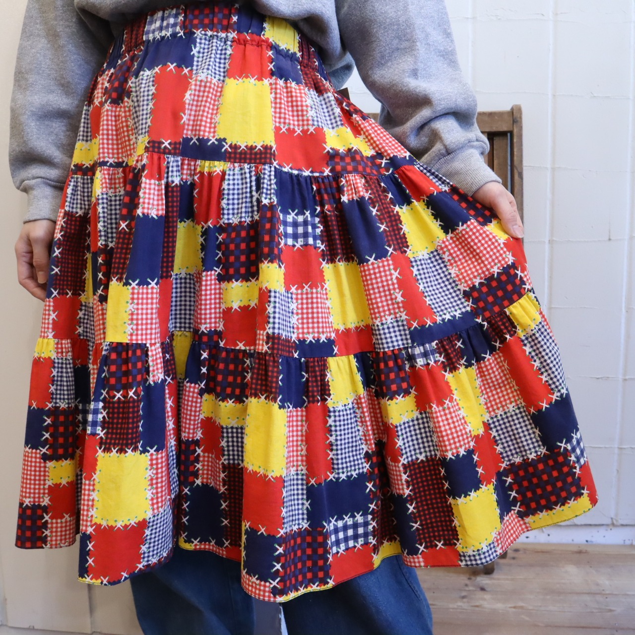 ギンガムチェックとプレーン、縫い合わさっているようなプリントが可愛いミドル丈のティアードスカートです。