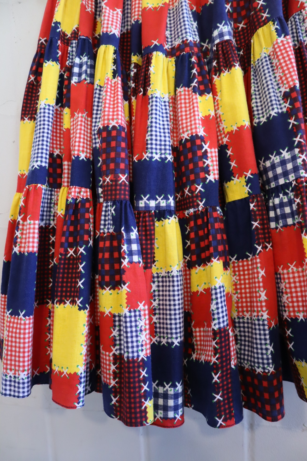 red×navy×yellow patchwork print tiered skirt [l-2590]